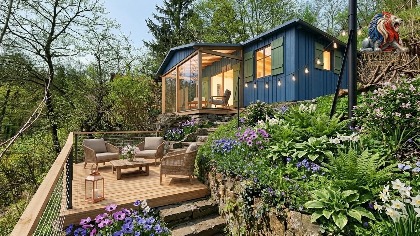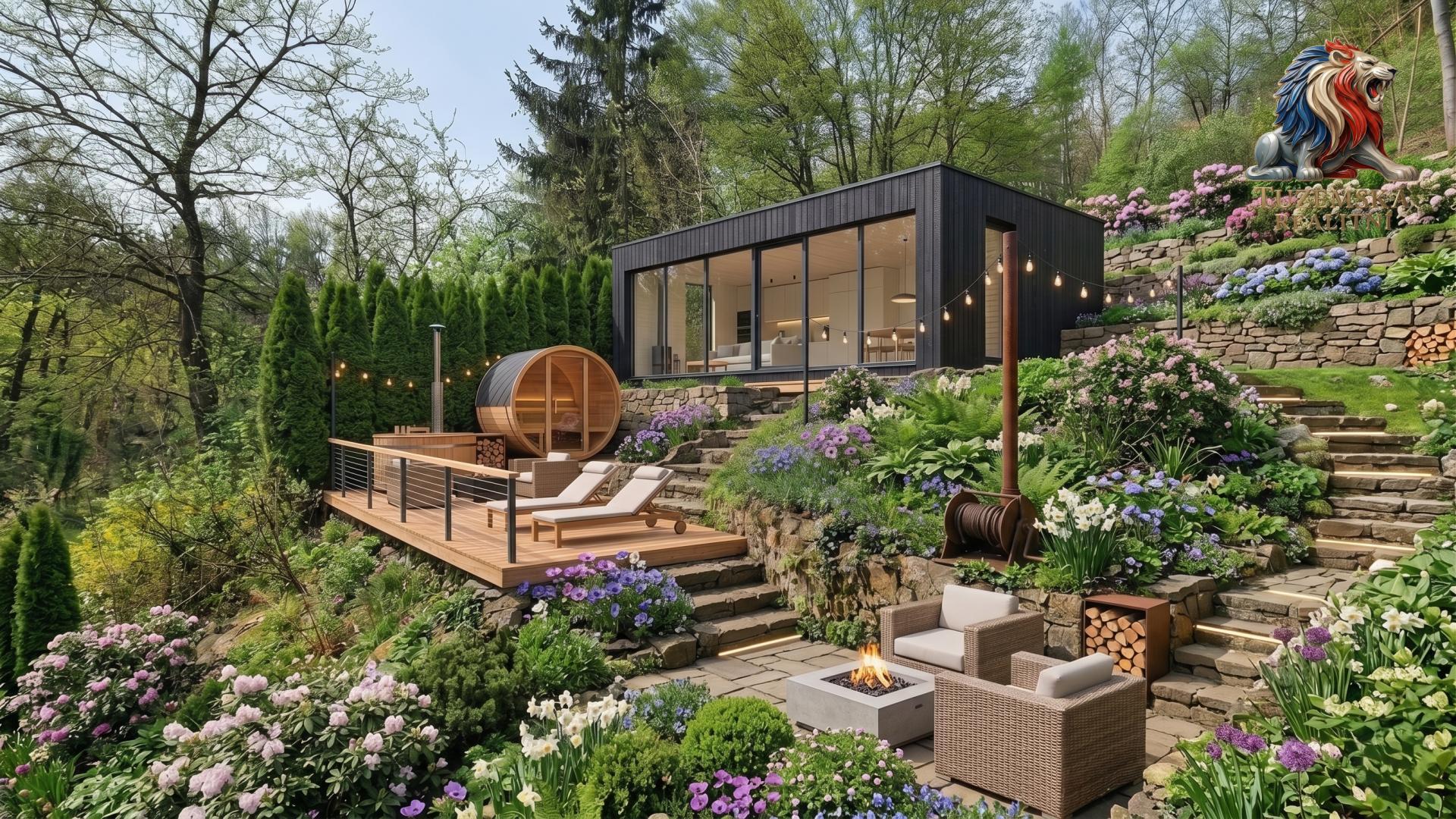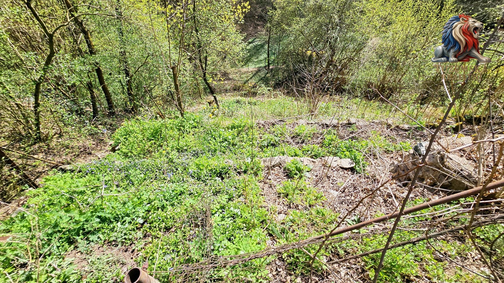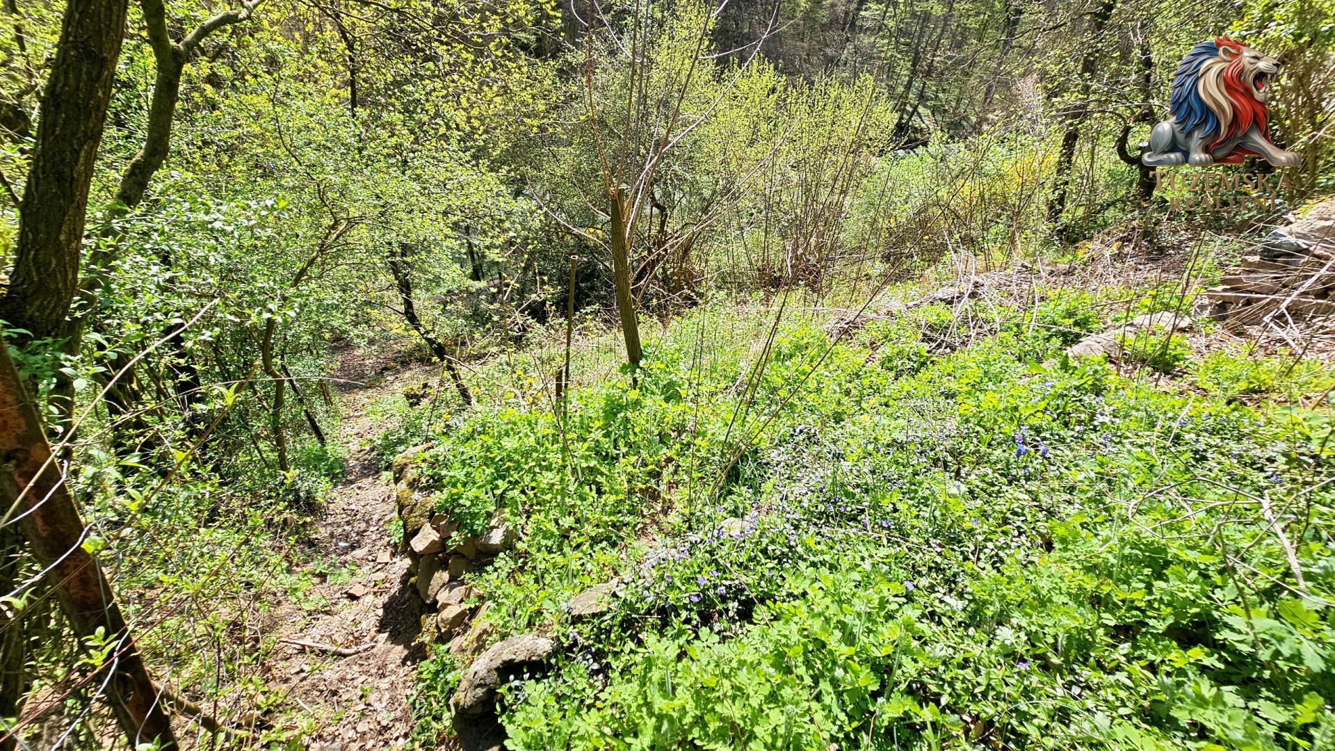 Pozemek je svažitý nakloněný jižním směrem, hezky na něj svítí slunce. Nahoře je hezký výhled, dole v údolí zase příjemný stín a klima. Po pravé straně pozemku jsou schůdky vedoucí nahoru k chatě a nad chatu. Po celé výšce jsou kaskády zpevněné zídkami vytvářející vodorovné plochy.