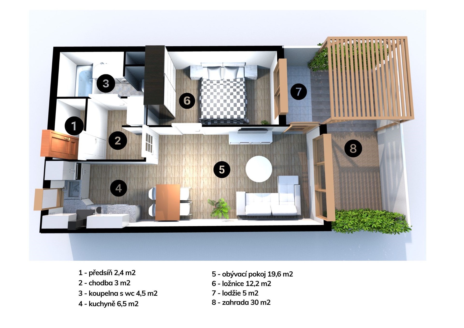 Velkou výhodou jsou okna v kuchyni i koupelně, která zajišťují přirozené denní světlo a možnost přirozeného větrání. Součástí bytu je také lodžie o velikosti 5 m², která přímo navazuje na soukromou zahradu o ploše 30 m² s pergolou a přívodem vody, což je ideální pro péči o zeleň, letní posezení či další venkovní aktivity. K bytu náleží také sklep o velikosti 1,7 m².