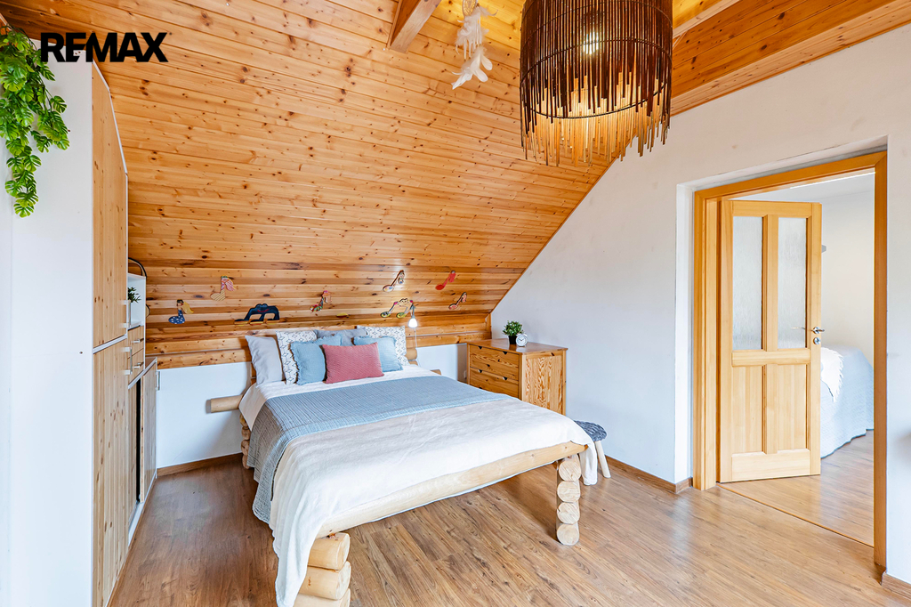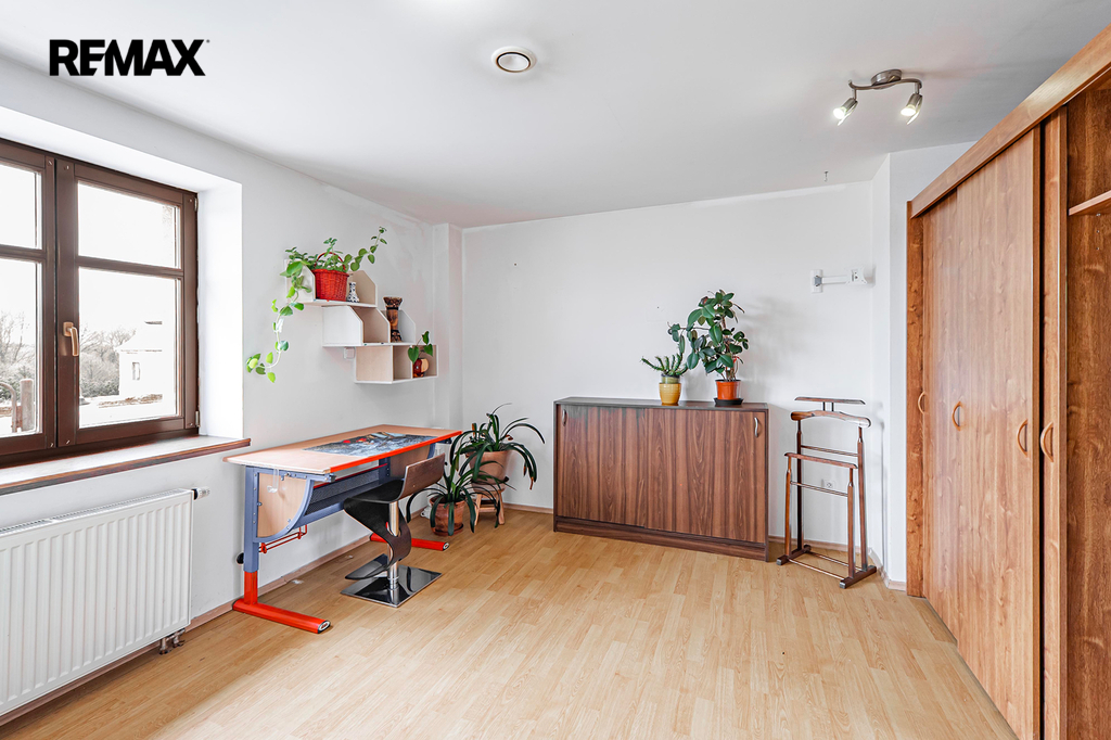V domě se nachází dvě kuchyně, obývací pokoj, čtyři samostatné pokoje v patře včetně šatny a malé spíže u horní kuchyně. V přízemí je jeden velký pokoj (aktuálně kadeřnictví) a přes chodbu další samostatný pokoj (bývalé kadeřnictví). Součástí domu je také zastřešená veranda (balkon), dvě koupelny (jedna v přízemí s oddělenou šatnou), pět toalet, garáž, malý sklep ve starší části domu s tlakovou nádobou na studnu, skladový prostor vedle garáže na zahradní nábytek a podzemní kamenný sklep s klenutými stropy ideální pro uskladnění zeleniny. Dispozice tedy umožňuje pohodlné vícegenerační soužití i oddělené provozy, případně kombinaci bydlení a podnikání.