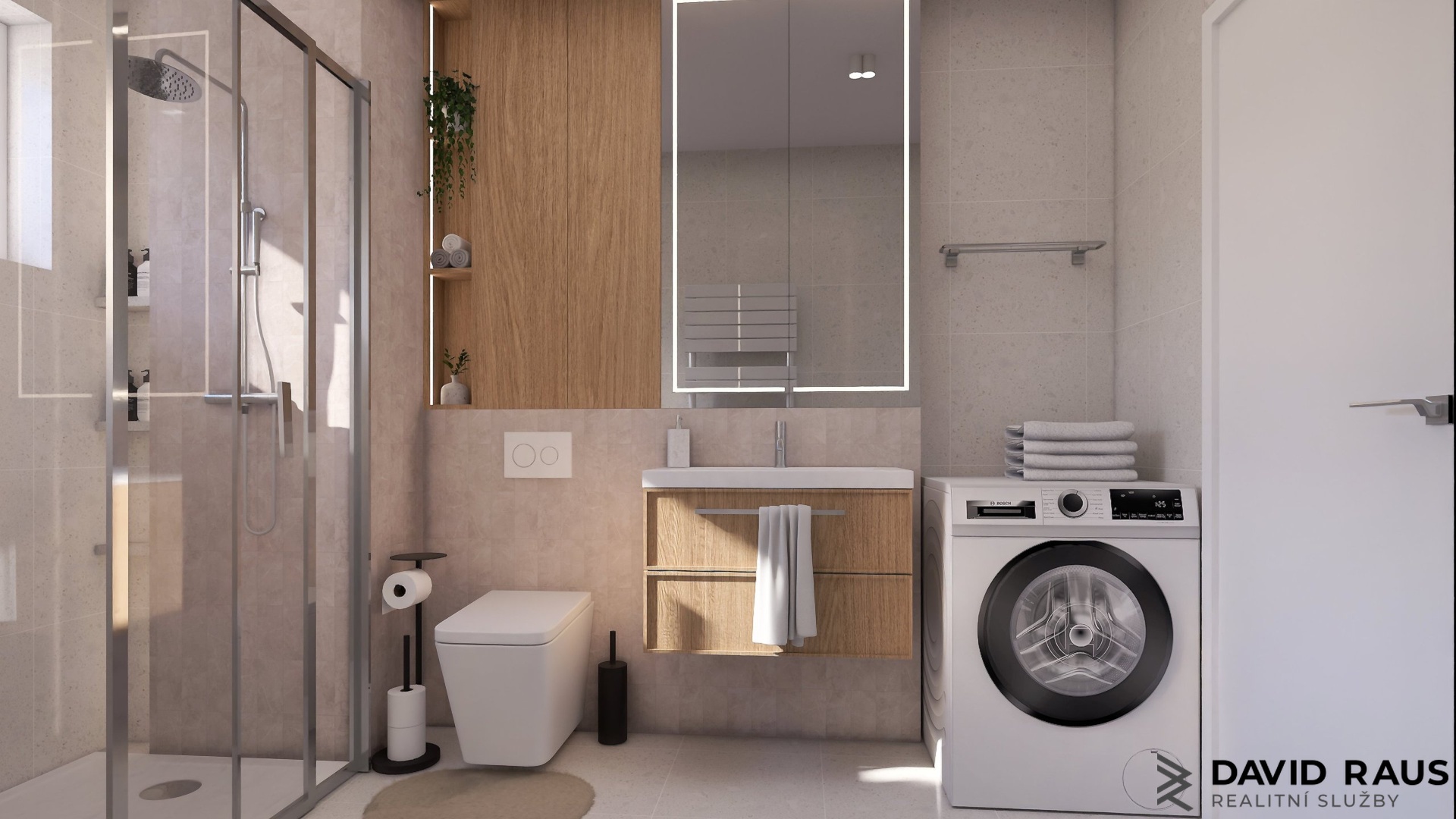 Hlavním vstupem se dostaneme do předsíně o velikosti 9,3 m². Prostor je navržen s důrazem na praktičnost a nabízí dostatek místa pro vestavěné skříně i pohodlné každodenní fungování. Po levé straně se nachází koupelna s toaletou o ploše 4,9 m². Dispozice počítá se sprchovým koutem, umyvadlem a místem pro pračku tak, aby byl prostor účelně využit a zároveň zůstal komfortní. Přímo naproti vstupu je situován samostatný pokoj o velikosti 11,6 m². Díky svému umístění mimo hlavní obytnou část poskytne dostatek klidu a soukromí, ať už jako ložnice, dětský pokoj nebo pracovna. Chodba pokračuje do tvaru písmene L a přirozeně odděluje vstupní část od denní zóny bytu. V její zadní části se vstupuje do hlavního obytného prostoru o rozloze 24,7 m². Otevřený koncept propojuje kuchyňský kout, jídelní část i obývací zónu v jeden funkční celek. Dispozice umožňuje pohodlné uspořádání kuchyňské linky podél stěny i dostatek místa pro jídelní stůl a sedací soupravu. Z obývací části je navržen přímý vstup na balkon o velikosti 4,2 m², který přirozeně rozšiřuje obytný prostor a nabízí příjemné místo k odpočinku.