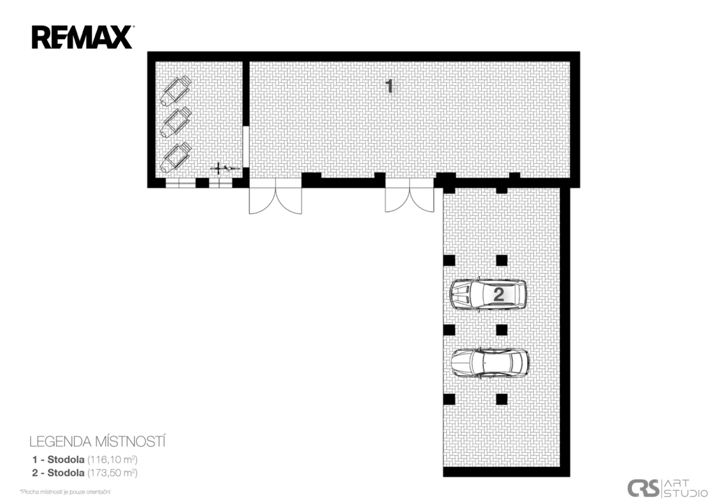 Unikátem je sál o rozloze 128 m² s vlastním vstupem z ulice – perfektní prostor pro showroom, ateliér, kanceláře, workshopy nebo jiný podnikatelský projekt. Na pozemku se nachází dvě velké stodoly (467 m² a 140 m²), které nabízejí široké možnosti využití – od skladování, dílny či servisu až po přestavbu na další obytné nebo komerční prostory.