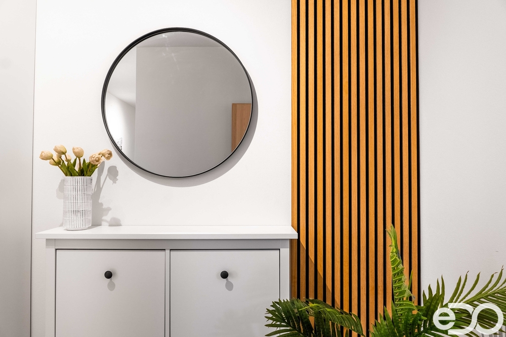 Byt se nachází ve 3. nadzemním podlaží a má podlahovou plochu 62,8 m². Dispozice zahrnuje obývací prostor s kuchyní a přímým vstupem na balkon o velikosti 1,6 m². Otevřený a vzdušný charakter obývacího pokoje s kuchyňským koutem umožňuje kromě obývací sestavy pohodlně umístit i pracovní kout nebo knihovnu. Kuchyňská linka je vyhotovena na míru v černo-dřevěném dekoru a osazena spotřebiči Bosch. K bytu dále náleží sklepní kóje o velikosti 2,2 m². Vybavení bytu může zůstat dle dohody.