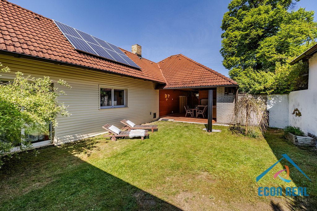 Tepelné čerpadlo Mitsubishi s napojením na topný systém (radiátory, rošty a podlahové topení), solární panely, retenční nádrž, vlastní vrtaná studna 25 m s novým motorem a hladinovým čidlem, ovládání vytápění a vířivky na dálku v mobilu, záložní kotel na tuhá paliva a septik s minimálními náklady.