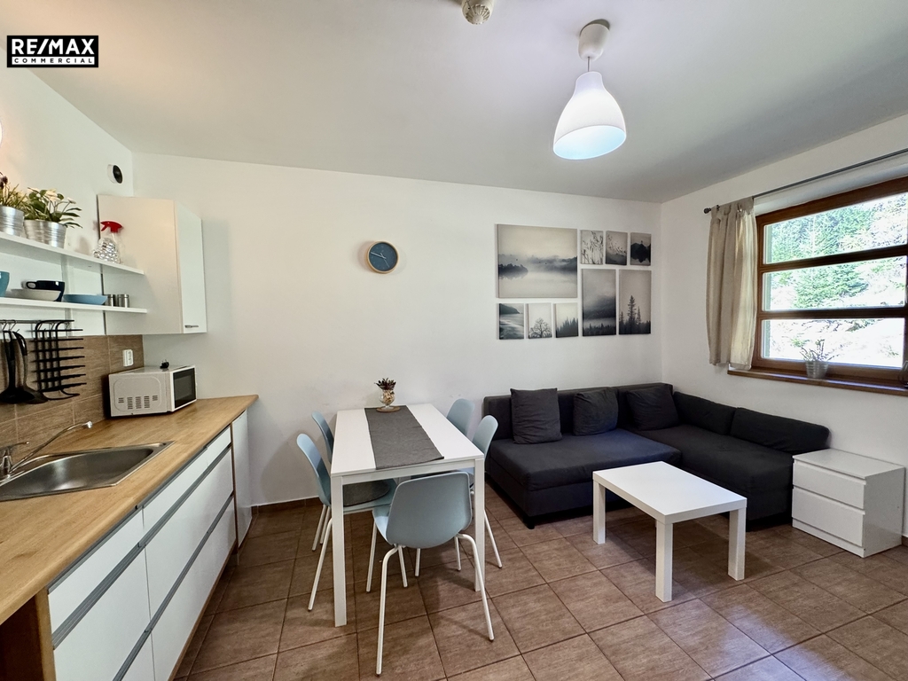 Apartmán se prodává kompletně vybavený – je tedy ihned připravený k užívání nebo k dalšímu pronájmu. Součástí je kuchyňská linka s el. vařičem, jídelní kout, rozkládací sedací souprava, dvě televize a útulné podkroví se třemi lůžky. Celý interiér je laděn v příjemném horském stylu s důrazem na pohodlí, funkčnost a teplou atmosféru dřeva. Vytápění je zajištěno lokálně elektrickým podlahovým topením s termostatem.