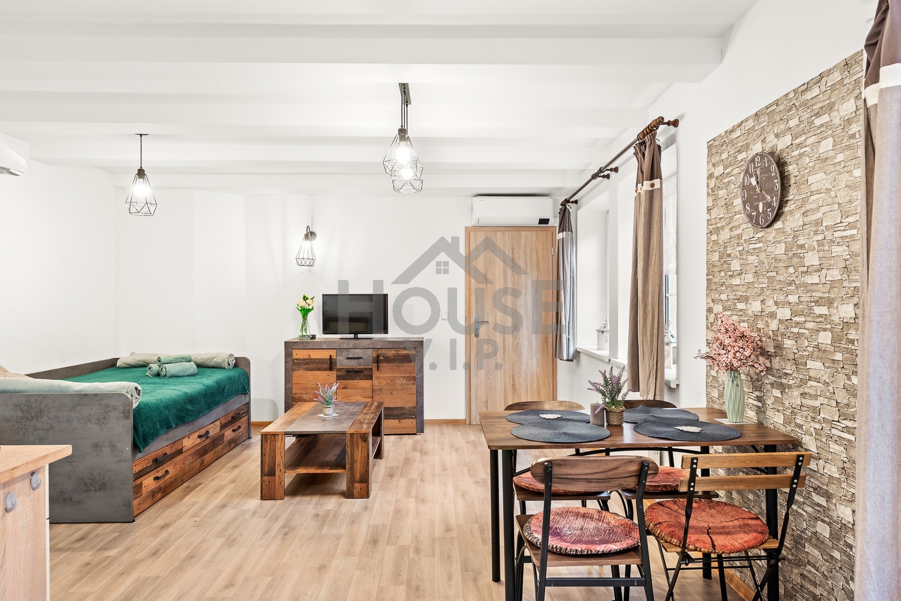 Obývací místnost je zařízena lůžkem, komodou, televizí, jídelním stolem a židlemi, klimatizace. Kuchyňský kout je kompletně vybavený - najdete zde lednici, mikrovlnnou troubu, varnou desku, myčku a kuchyňskou linku. V ložnici se nachází manželská postel, noční stolky a komoda, což zajišťuje dostatek úložného prostoru.