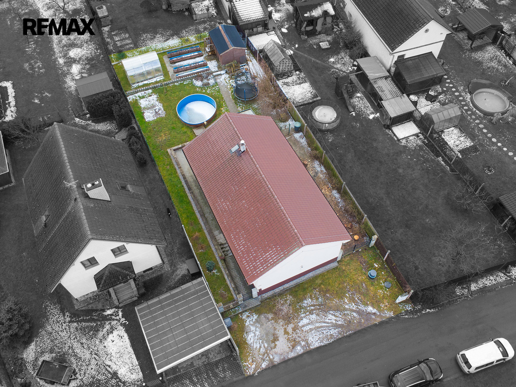 Před domem je parkoviště pro tři automobily, za domem pak nalezneme relaxační zónu s terasou a bazénem. Ale také se skleníkem a vyvýšenými záhony. Srdce zahradníka zaplesá.