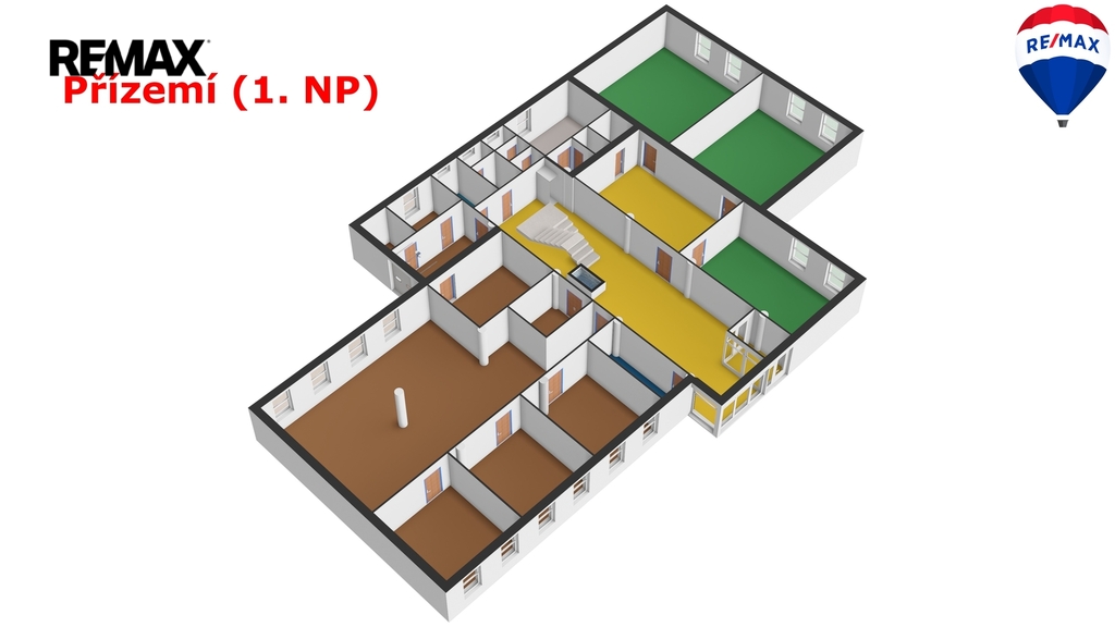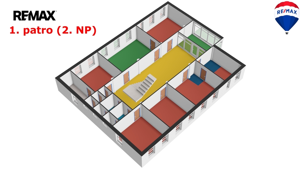 1. NP: reprezentativní vstup, recepce, zasedací/školicí místnosti, kanceláře a kompletní zázemí (kuchyňky, sociální zařízení, sklady). Díky přímému vstupu z úrovně terénu je parter vhodný i pro klientský provoz, showroom, školení či ordinace.