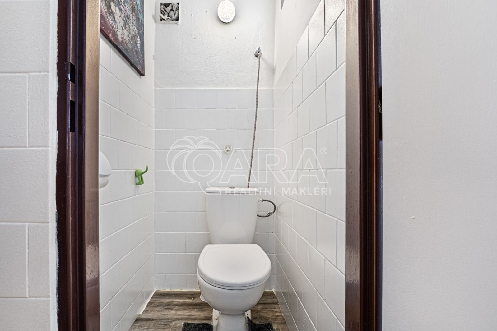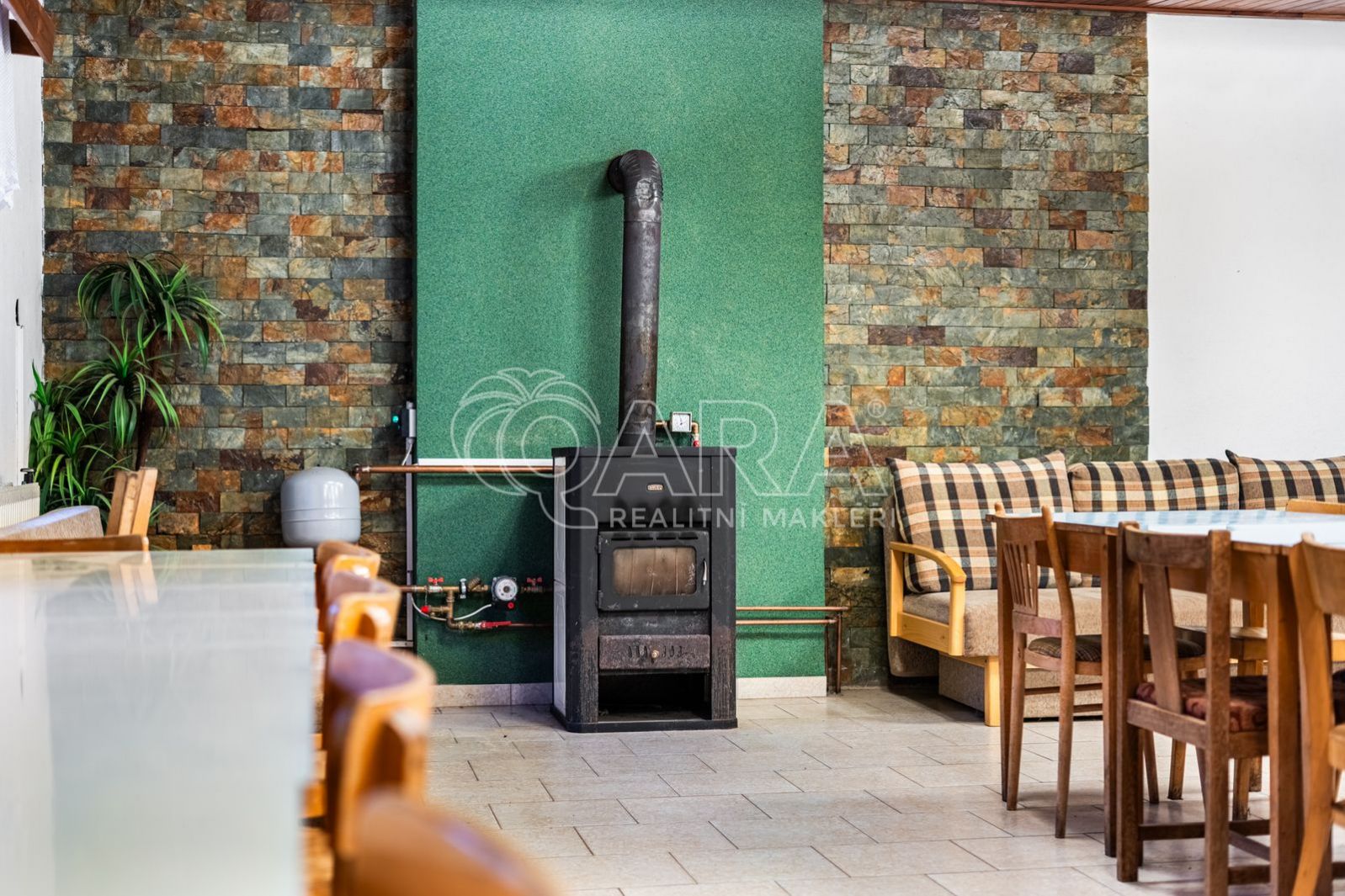 V přízemí se nachází vstupní chodba, dva sklady, kuchyň, prostorný společenský sál s barem a krbovými kamny, dámské a pánské toalety, sprchový kout a technické zázemí.