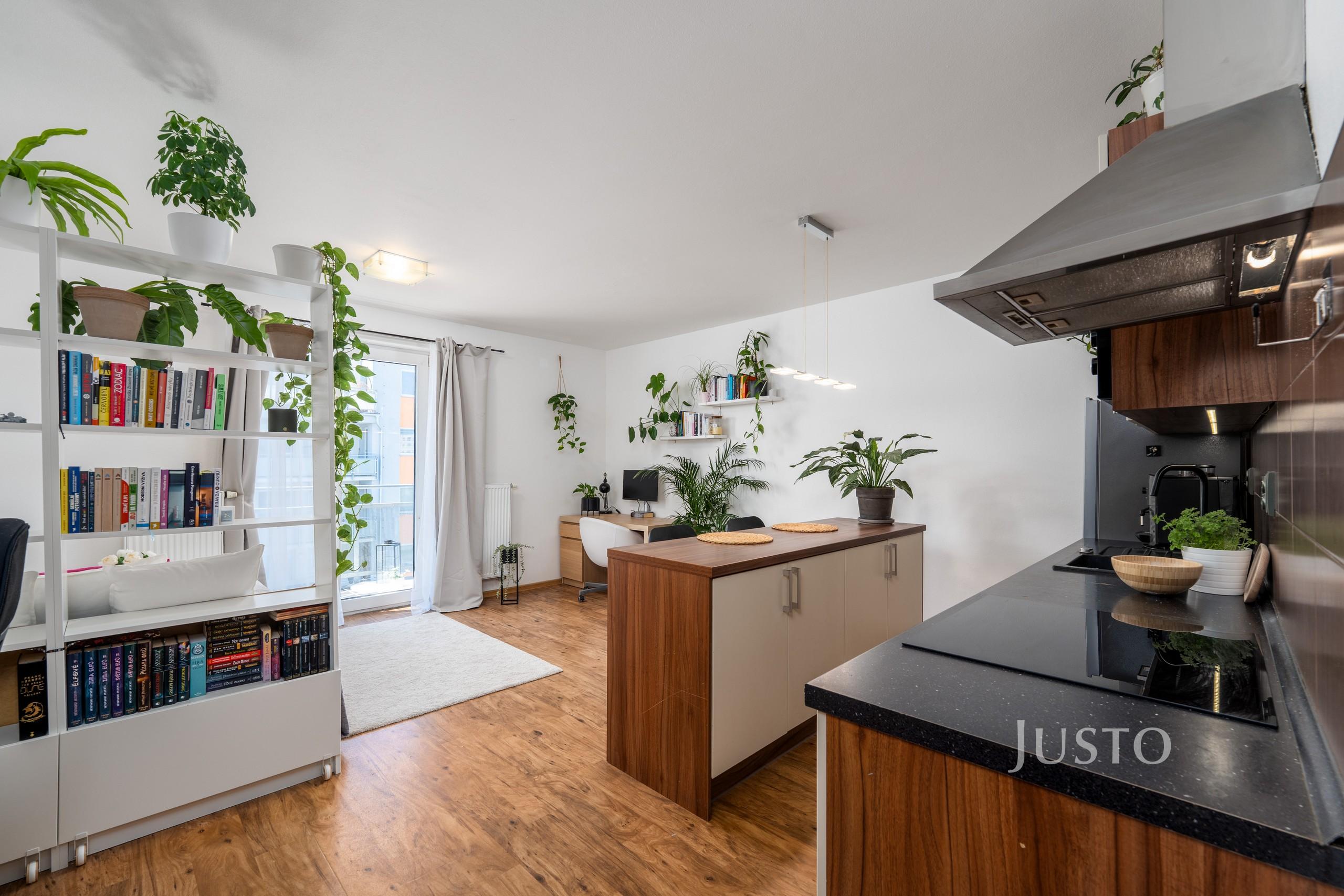 Hlavní obytná místnost s vinylovou podlahovou krytinou je propojená s kuchyňským koutem a využívá každý centimetr na maximum. Kuchyně s ostrůvkem, spací část, pracovní kout a home-office na slunném balkóně. Moderní kuchyňská linka na míru poskytuje kompletní vybavení spotřebiči – indukční varná deska, horkovzdušná trouba, digestoř s odtahem, myčka, mikrovlnná trouba i lednice s mrazákem. Prostor působí velmi příjemně a nabízí dostatek místa nejen pro odpočinek, ale i pro práci z domova nebo studium.