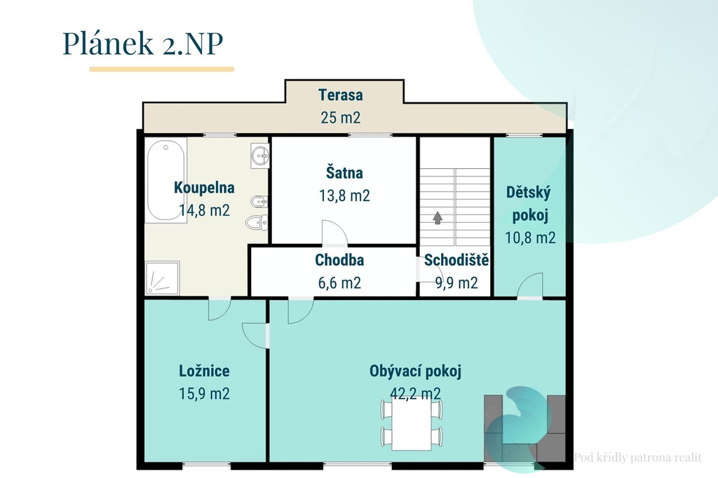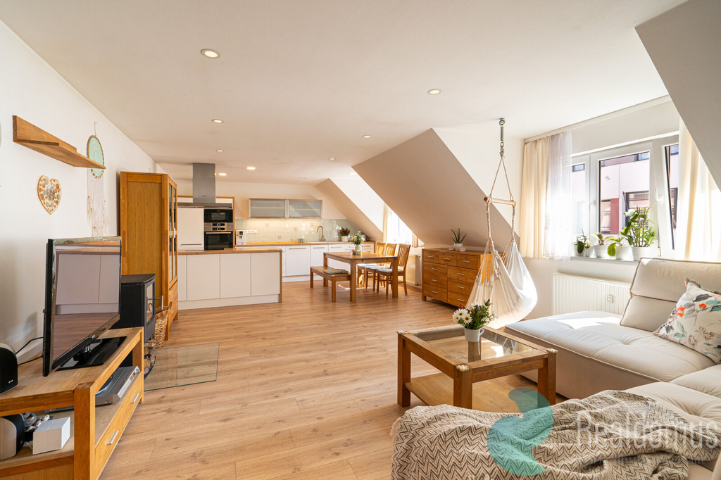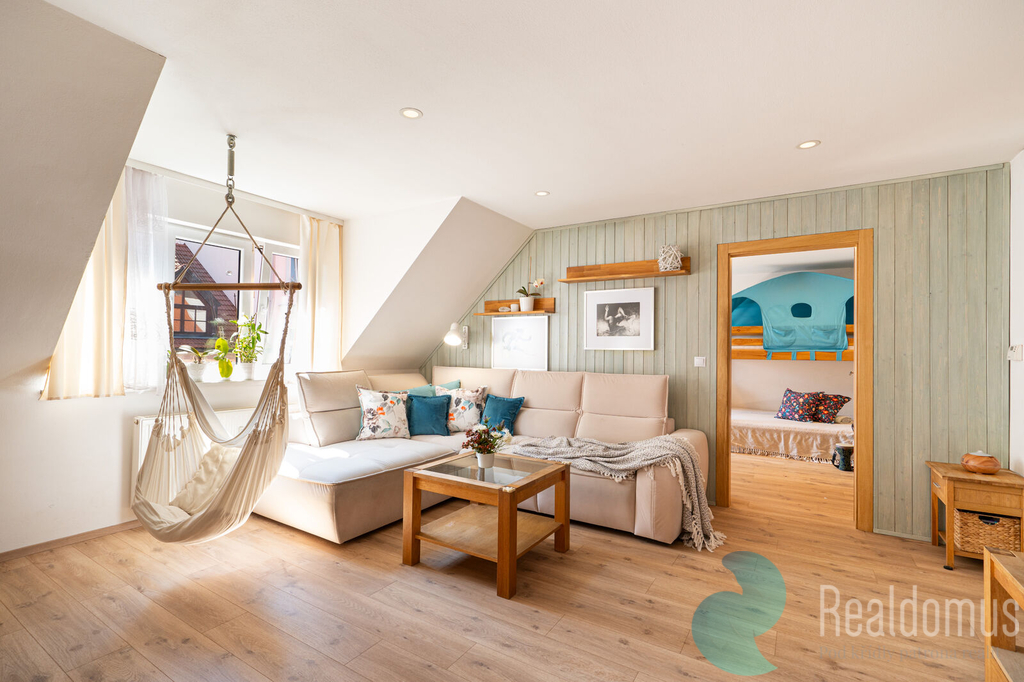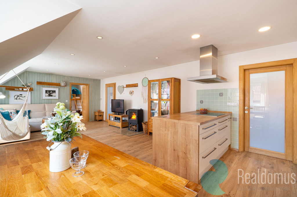 Ve 2. NP je pak velký, stylový a prosvětlený podkrovní byt 3kk (104 m2) s nádhernou novou kuchyní a místností se saunou, Byt má velkorysou hlavní obytnou místnost (41 m2) s kuchyňským koutem, jídelnou a obývacím pokojem s krbovými kamny. Dále zde najdeme ložnici, dětský pokoj, koupelnu s vanou, sprchovým koutem a toaletou, Další toaleta se nachází v místnosti u vchodu do bytu, kde je i velké vestavěné umyvadlo a sauna.