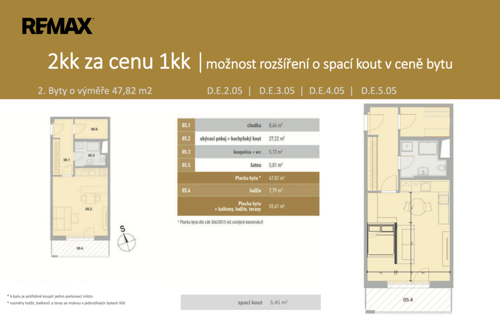 Nabízíme bytovou jednotku D.E.3.05. Dispozice 1+kk o výměře 47,82 m² s velkorysou lodžií (7,89 m²) vás nadchne svým komfortem a luxusním životním stylem. K bytu dále náleží sklep o výměře 2,2 m², který poskytuje praktický úložný prostor. U vybraných bytů vám navíc nabízíme možnost úpravy dispozice formou příčky bez navýšení ceny – touto úpravou si jednoduše oddělíte spací prostor od obytné místnosti. Byt je připraven k okamžitému nastěhování.