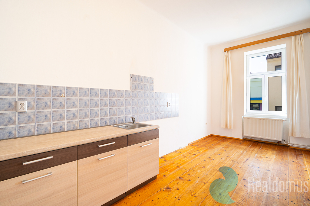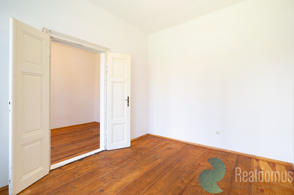 Byt disponuje prostorným obývacím pokojem orientovaným na jih, ložnicí a dětským pokojem situovanými na severní stranu s výhledem do zahrady. Kuchyně je samostatná, dále koupelna s WC. Kuchyňská linka je určena k rekonstrukci. Na podlahách jsou původní dřevěné parkety, které lze krásně zrenovovat, a vysoké stropy dodávají bytu vzdušnost a eleganci. Vytápění zajišťuje úsporný kondenzační plynový kotel. K bytu dále náleží sklep o výměře 10 m2.