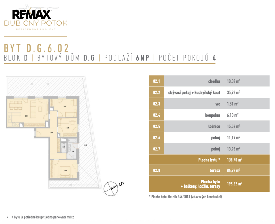 Nabízíme exkluzivní bytovou jednotku 4+kk D.G.6.02 v rezidenci Dubičný Potok v Českých Budějovicích. K prostorné ploše 108,70 m2 náleží velkorysá rohová terasa o výměře 86,92 m2. Byt je připraven k okamžitému nastěhování.
