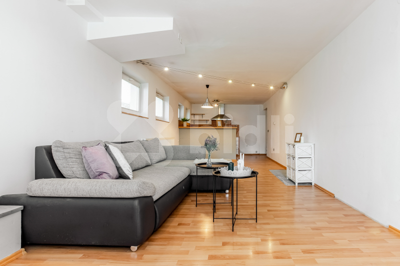 V 1. nadzemním podlaží se nachází byt 4kk (cca 90 m2): vstupní prostor, obývací pokoj s kuchyňským koutem, dětský pokoj, pracovna, ložnice a koupelna s WC a bidetem.