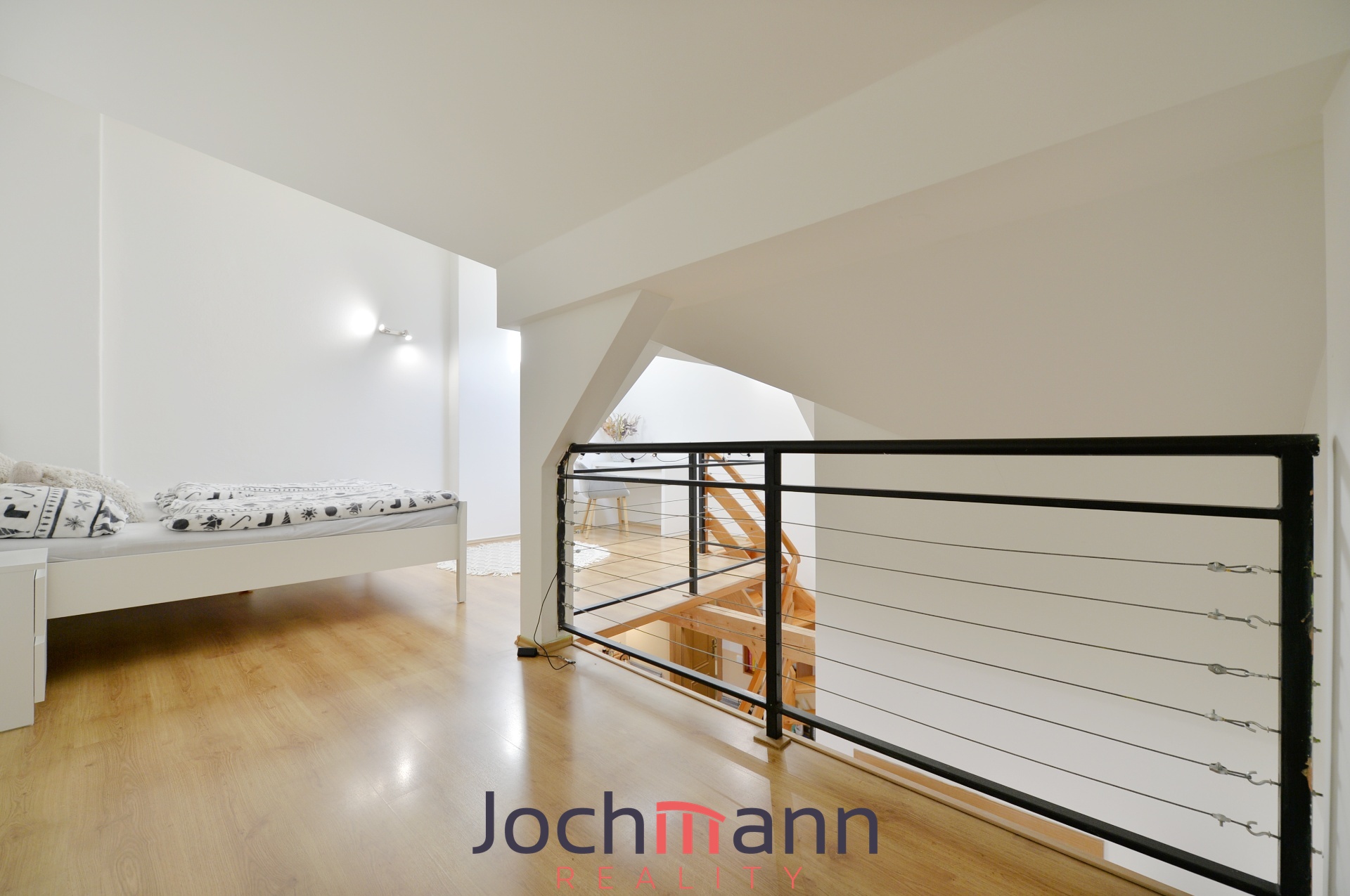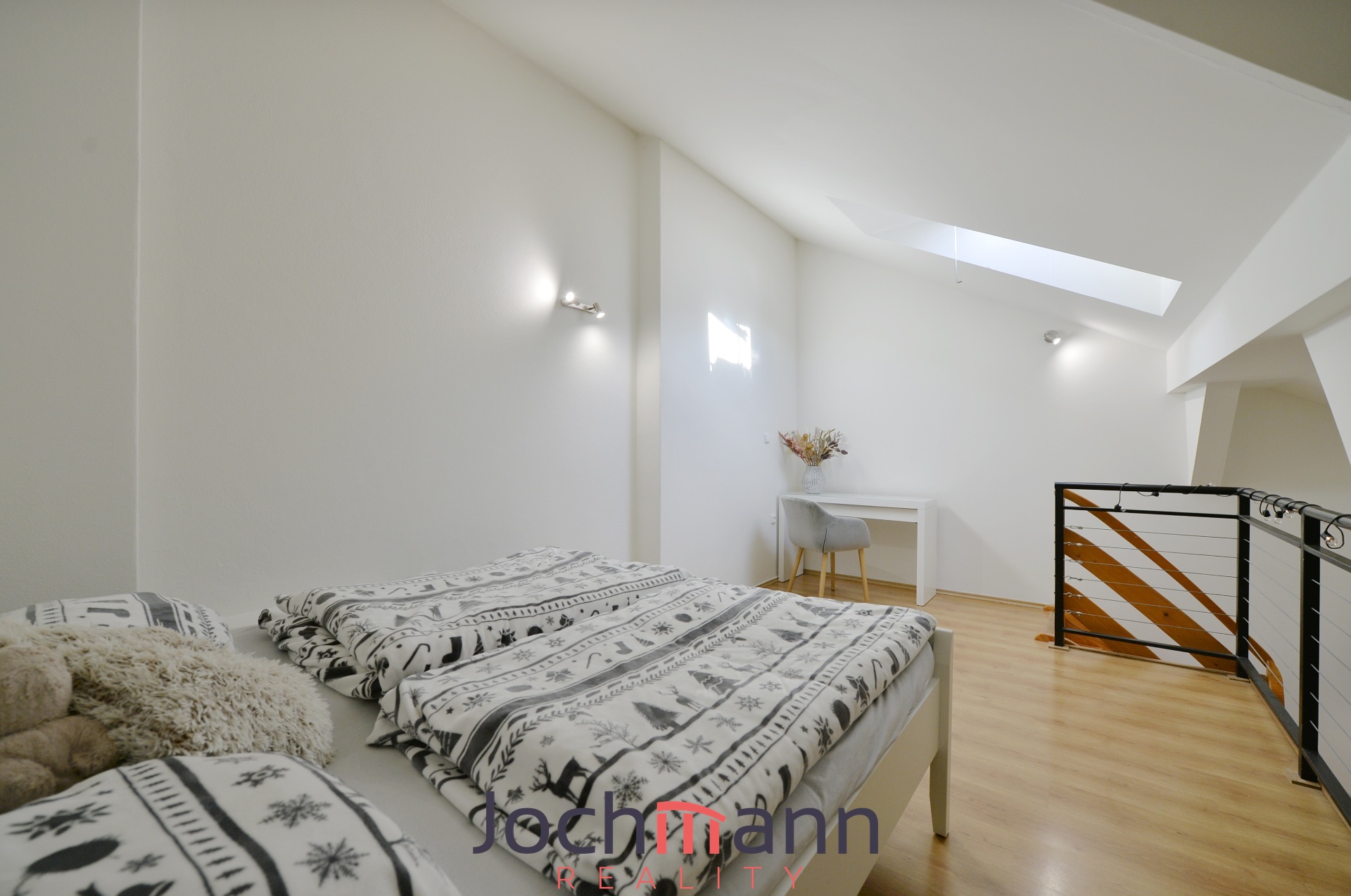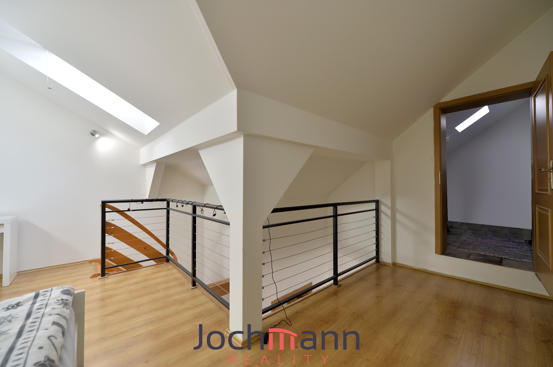 Byt je prakticky řešený, ve spodním podlaží najdete vstupní chodbu, prostorný obývací pokoj s kuchyňským koutem a moderní koupelnu se sprchovým koutem. Po dřevěném schodišti se dostanete do horního patra, kde je dostatek prostoru pro ložnici i pracovní zónu. Součástí podkroví je také velká šatna, která nabízí dostatek úložného prostoru.