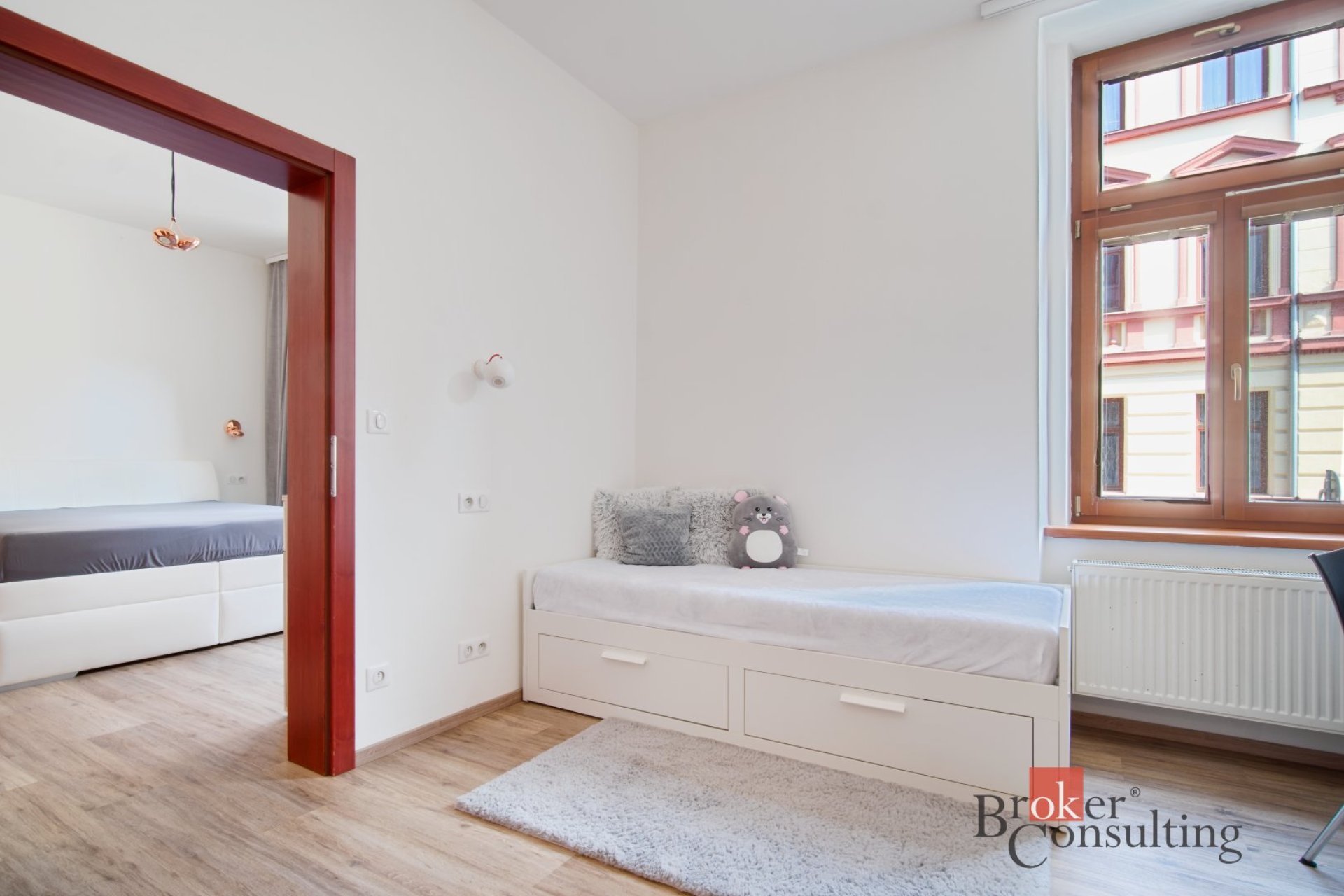 Tento krásný byt zaujme nejen svou velkorysou výměrou, ale především promyšleným dispozičním řešením a nadstandardním komfortem. Dominantou bytu je prostorný a světlý obývací pokoj s jídelní částí, na který navazuje samostatná kuchyně. Dále byt nabízí dva pokoje, přičemž jeden z nich je velmi prakticky řešen, je přístupný jak přes šatnu, tak i z vedlejšího pokoje, a disponuje vlastní koupelnou, což zajišťuje dostatek soukromí i komfortu.
