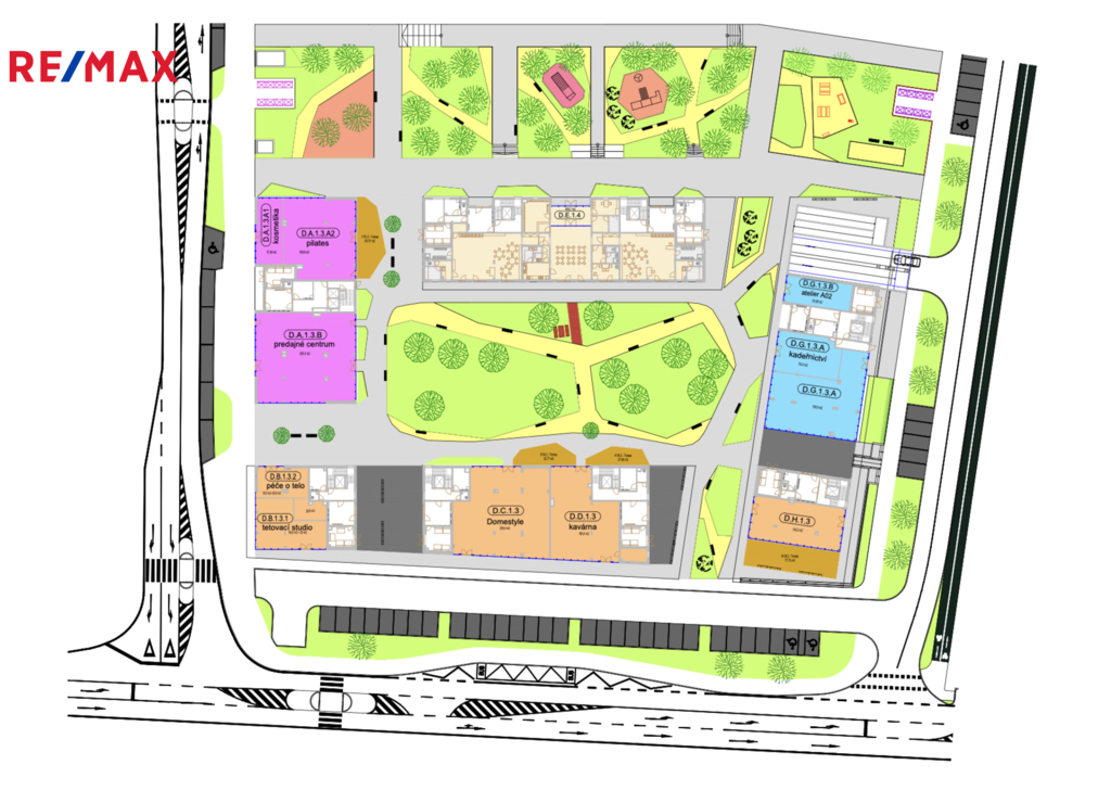 Jednotka D.B.1.3.2 o celkové výměře 50 m² je ze dvou stran prosklená směrem, což zajišťuje dostatek denního světla a dobrou viditelnost prostoru. Dispozice je vhodná zejména pro masáže, fyzioterapii a další služby zaměřené na péči o tělo. (Kadeřnické a kosmetické služby jsou již v rámci rezidence zastoupeny.)
