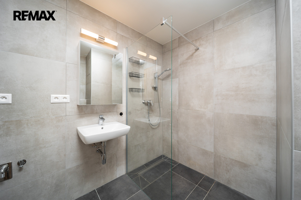 Standard bytu splní i náročnější požadavky – podlahové vytápění v celém bytě, kvalitní vinylové podlahy v dekoru dřeva a dálkově ovládané venkovní žaluzie pro maximální komfort. Koupelna je řešena moderně s velkoformátovou dlažbou, závěsným WC, sprchovým koutem a přípojkou na pračku a sušičku.