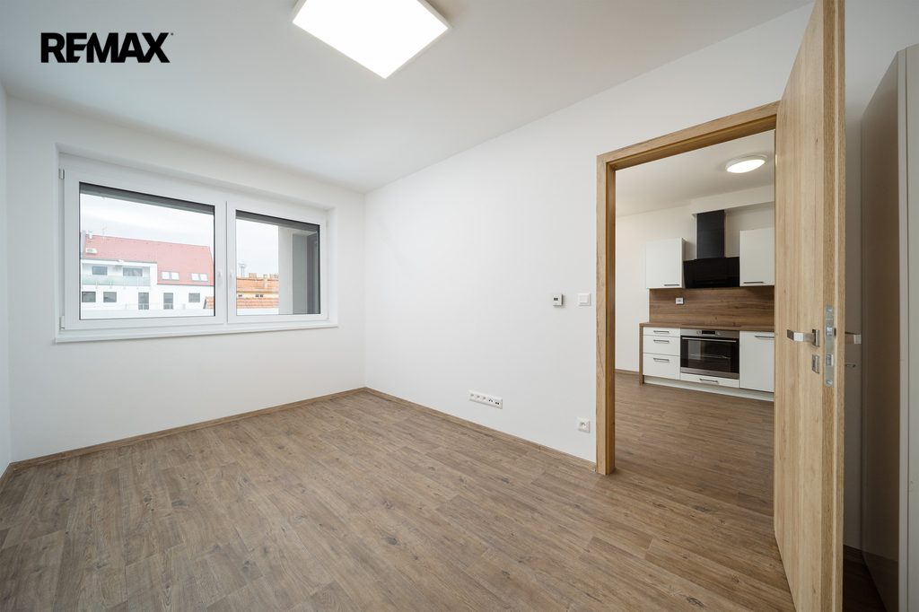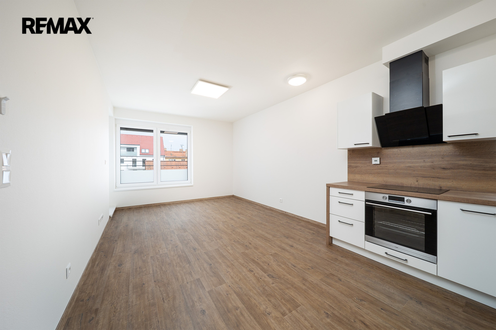 Interiér bytu je řešen s důrazem na komfort a funkčnost. Dominantou je světlý obývací prostor s plně vybavenou kuchyňskou linkou včetně všech spotřebičů (myčka nádobí, mikrovlnná trouba, indukční deska, lednice s mrazákem a další). Prostor působí vzdušně a je ideální pro každodenní fungování i relax. Byt je částečně vybaven skříněmi, které lze nahradit vlastním nábytkem.