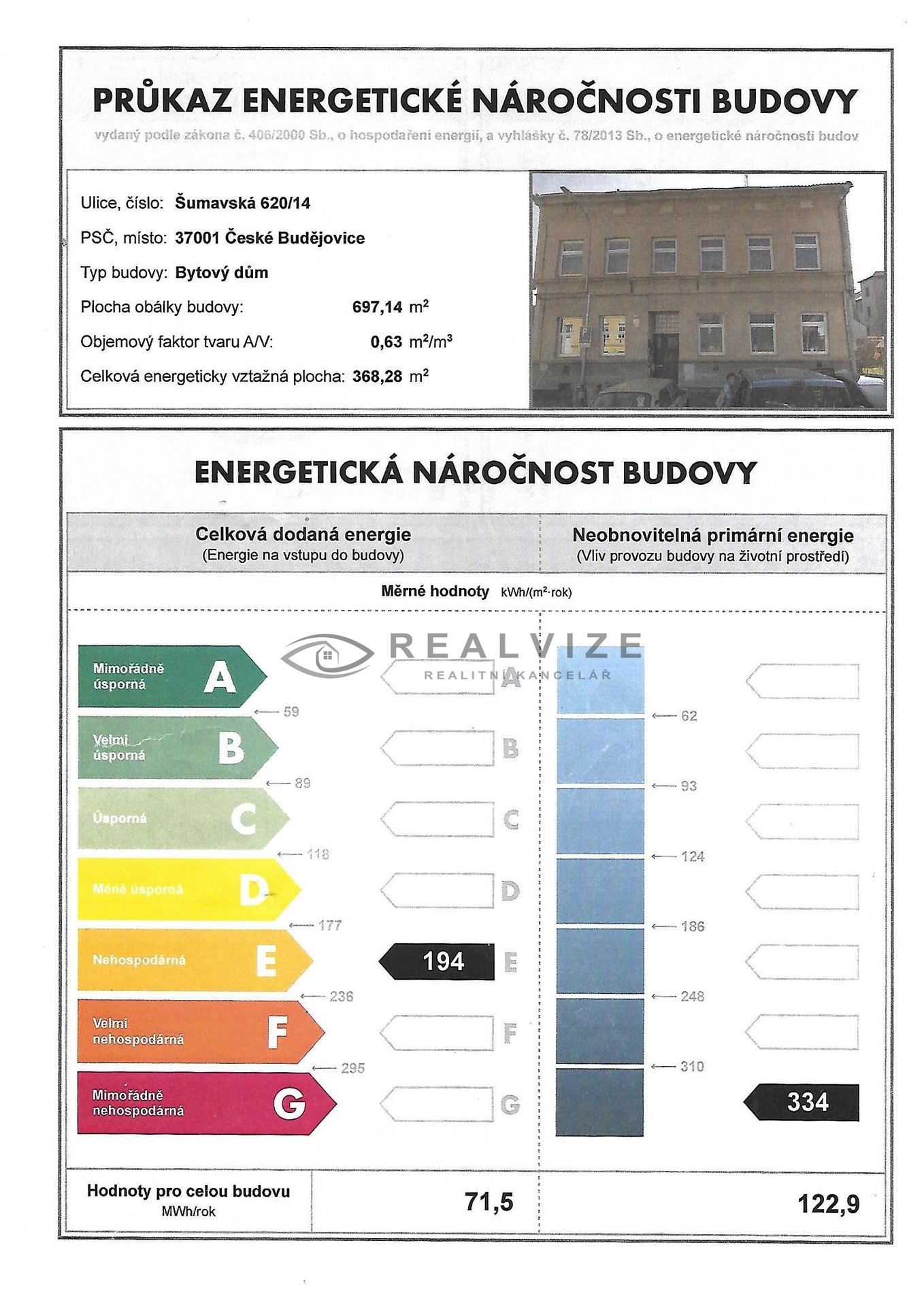 - Ukazatel energetické náročnosti budovy: 71 kWh/m²