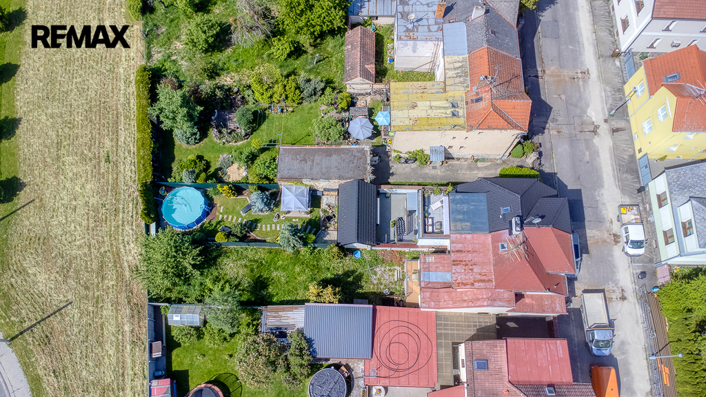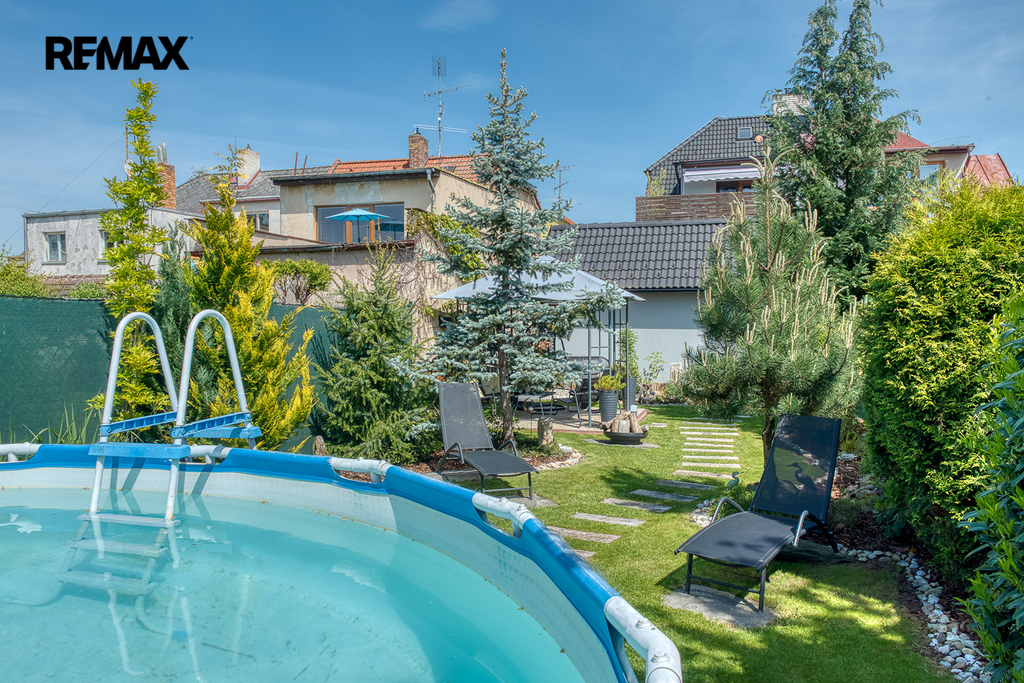 Součástí domu je velmi pěkně udržovaná zahrada s altánkem a nadzemním bazénem, která nabízí dostatek soukromí a prostoru pro rodinnou relaxaci, grilování nebo dětské hry. Zahrada je okrasná, poskytuje příjemné zákoutí i v horkých letních dnech a je ideální pro pěstování květin i drobných plodin.