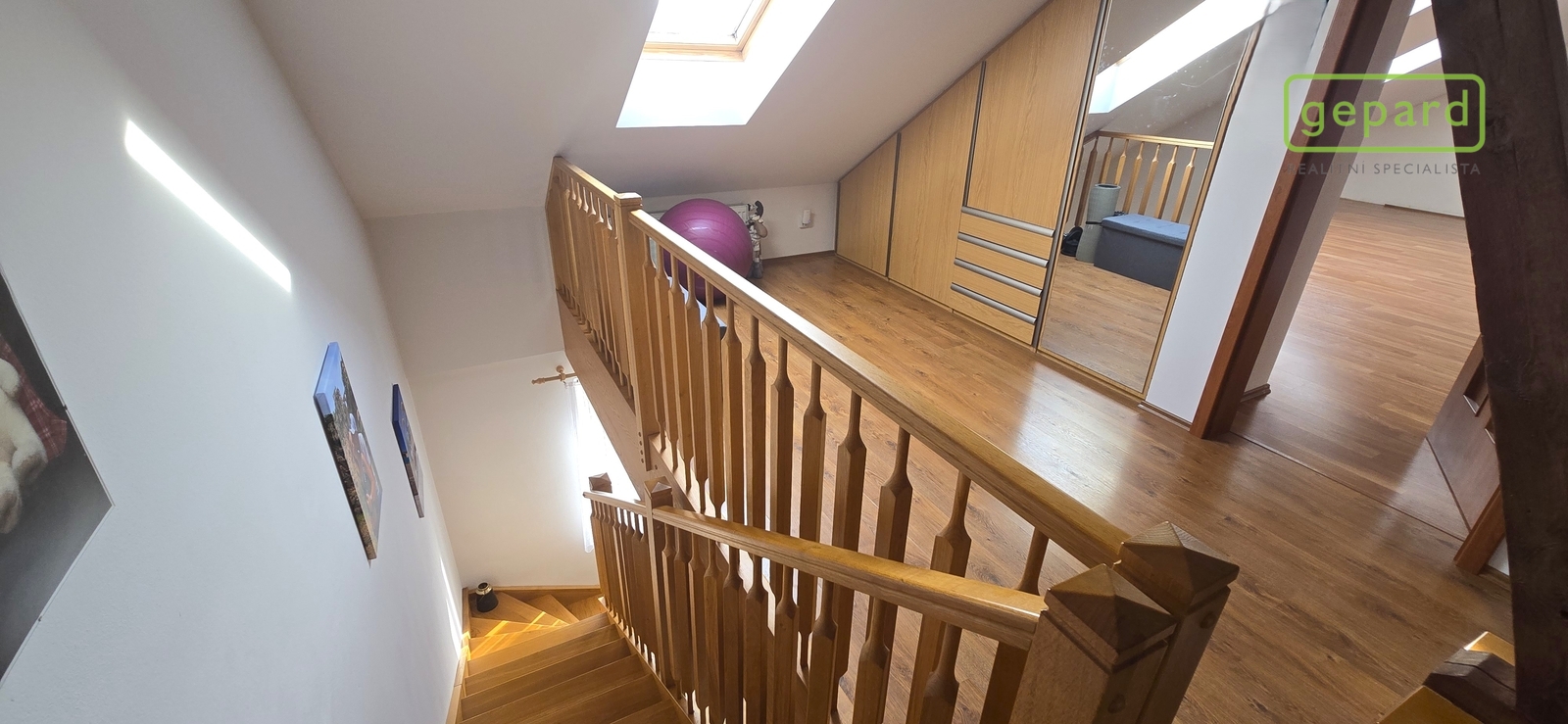 Dispozice: Vchod, předsíň (4,4m2) ze které se vpravo vstupuje do zděné koupelny (6,5m2) vybavené sprchovacím koutem, umyvadlem a toaletou, dále se na konci předsíně, která je vybavena vestavnou úložnou skříní a dveřmi do obývacího pokoje dostaneme do prostorné kuchyně (10,3m2). Z této se vchází do obývacího pokoje (29,4m2), který je vybaven klimatizační jednotkou a z něhož se vpravo dostaneme do ložnice (11,8m2) a z levé strany masivním dřevěným schodištěm do mezonetového prostoru, který je tvořen centrální chodbou - galerií (20m2) s úklidovou komorou (2,4m2), druhou koupelnou (6,4m2) vybavenou sprchovacím koutem a toaletou, úložným prostorem a dvěma pokoji (22,9 m2 a 25,2m2), které mají každý vlastní vstup, ale zároveň jsou propojeny dveřmi v příčce. Mohou tak být vzájemně průchozí, ale i zcela samostatné.