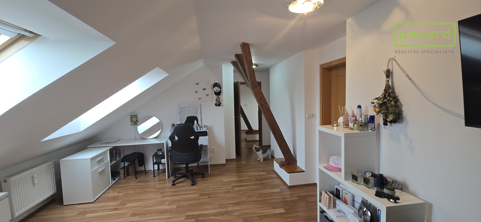 Tato část bytu je koncipována jako podkrovní a její součástí jsou i pohledové dřevěné stropní trámy a střešní okna. V bytě je velké množství dřevěných prvků, plovoucí a parketové podlahy, na chodbě a v koupelnách jsou dlažby.