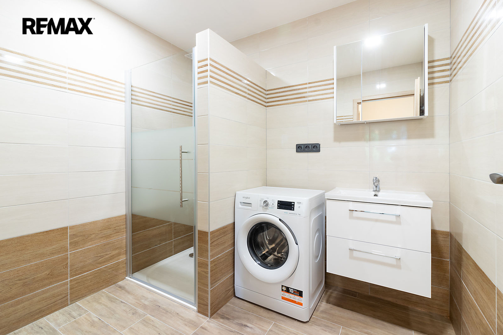 Byt je částečně vybavený – kuchyňská linka s vestavěnými spotřebiči (lednice, mrazák, trouba, varná deska, digestoř a myčka), velká šatní skříň, botník, věšák, pračka. Na oknech jsou namontovány venkovní žaluzie.