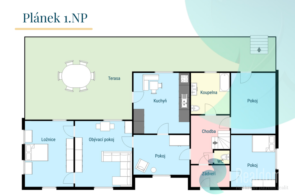 Prostorná terasa v přízemí a menší terasa do zahrady