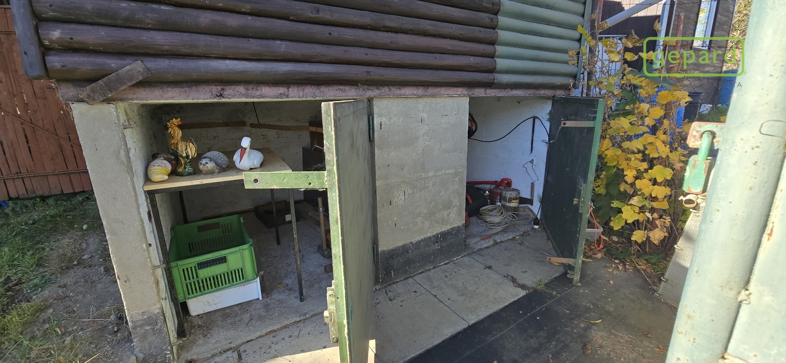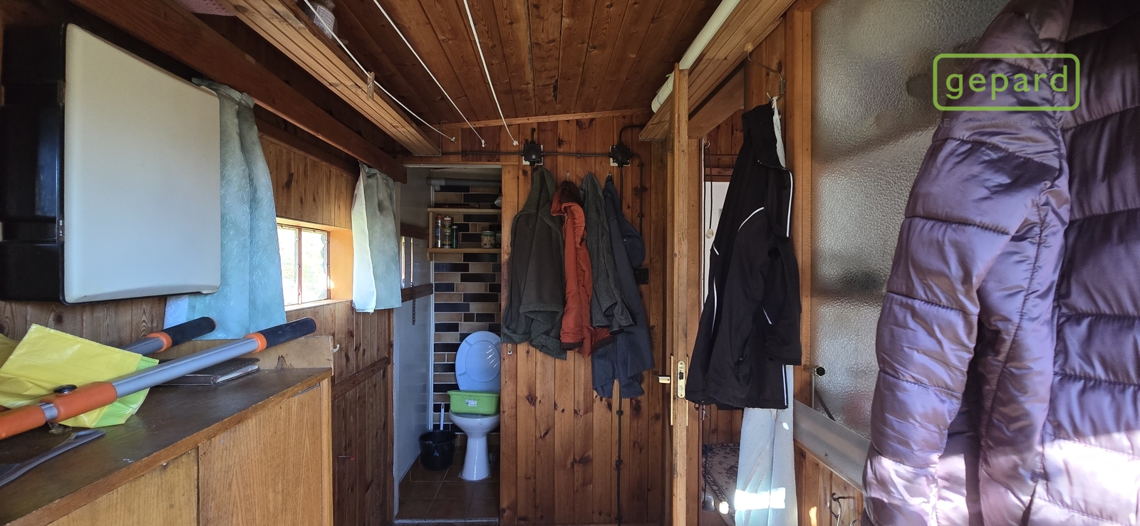 K dispozici je dále toaleta, sprcha, kuchyně a malá místnost s postelí. U chatky je dále zastřešená pergola.