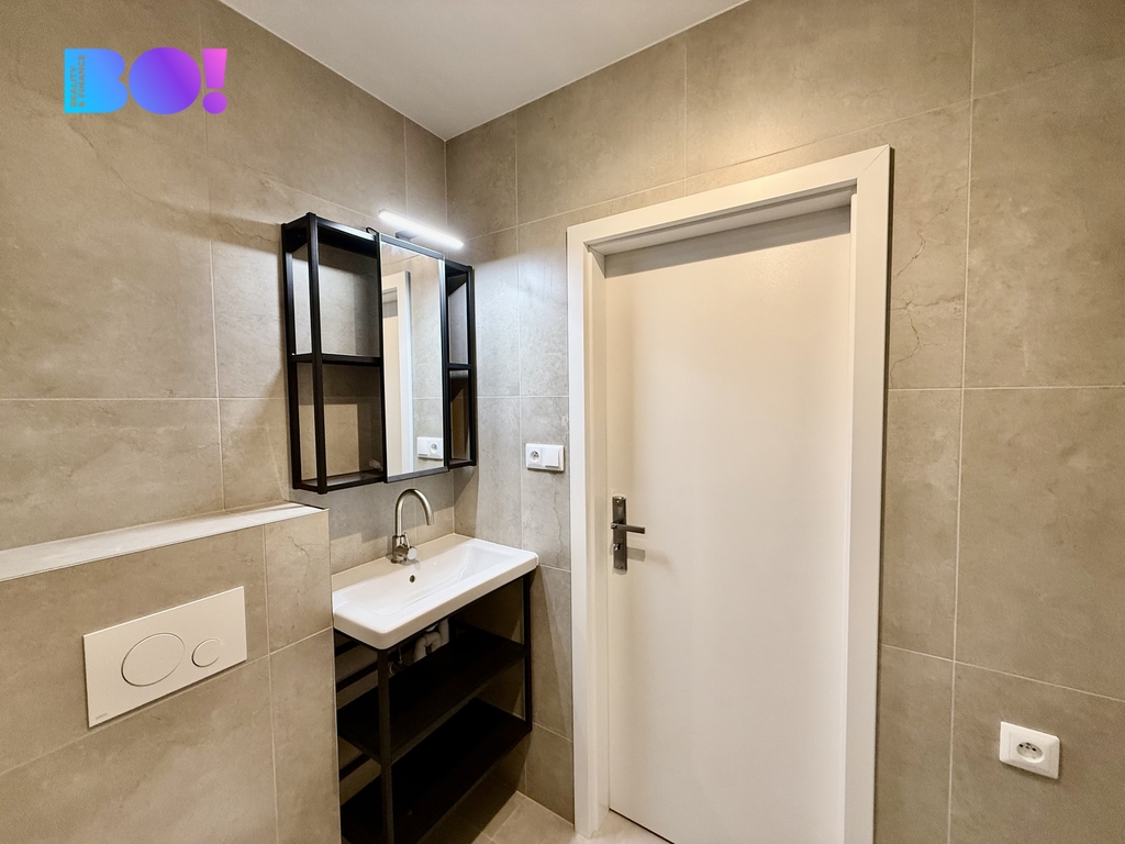Velkou výhodou je prostorná koupelna v elegantním provedení. Samozřejmostí jsou vinylové podlahy, které jsou praktické na údržbu a zároveň dobře ladí s celkovým stylem bytu.