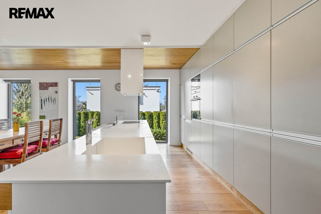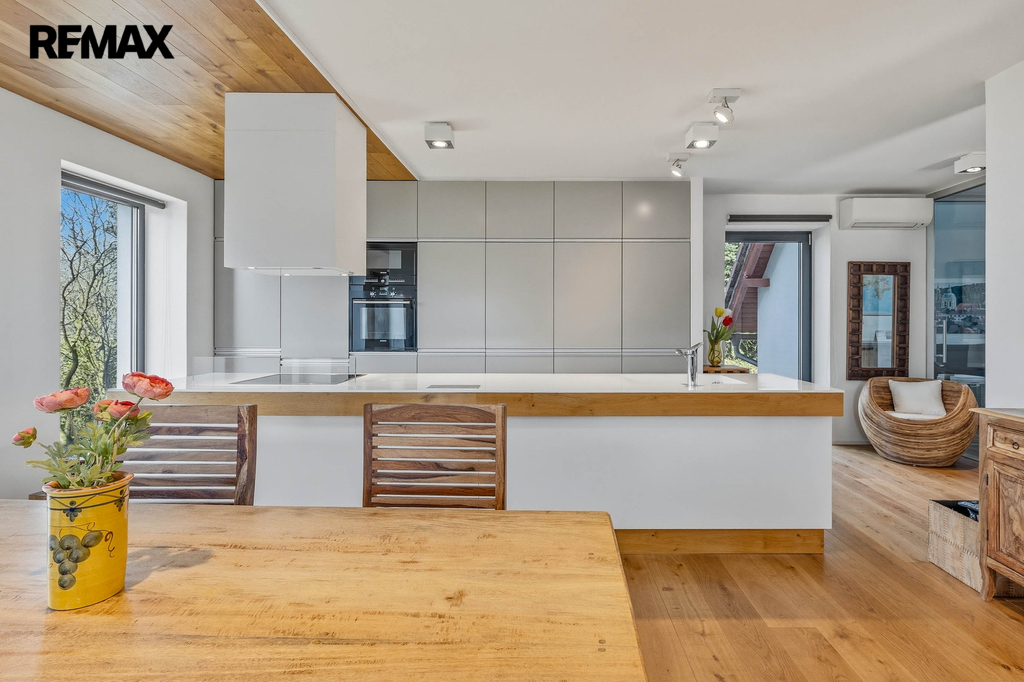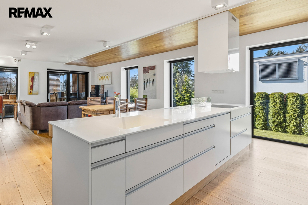 Dominantou domu je velkorysý obytný prostor plynule navazující na terasu a zahradu – místo, kde se přirozeně potkává rodina i přátelé. Kuchyně je navržena jako srdce domova – elegantní, funkční a připravená na každodenní život i společenské chvíle.