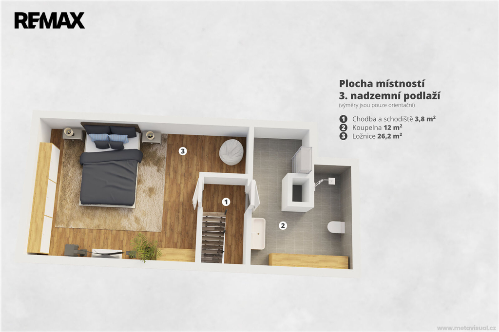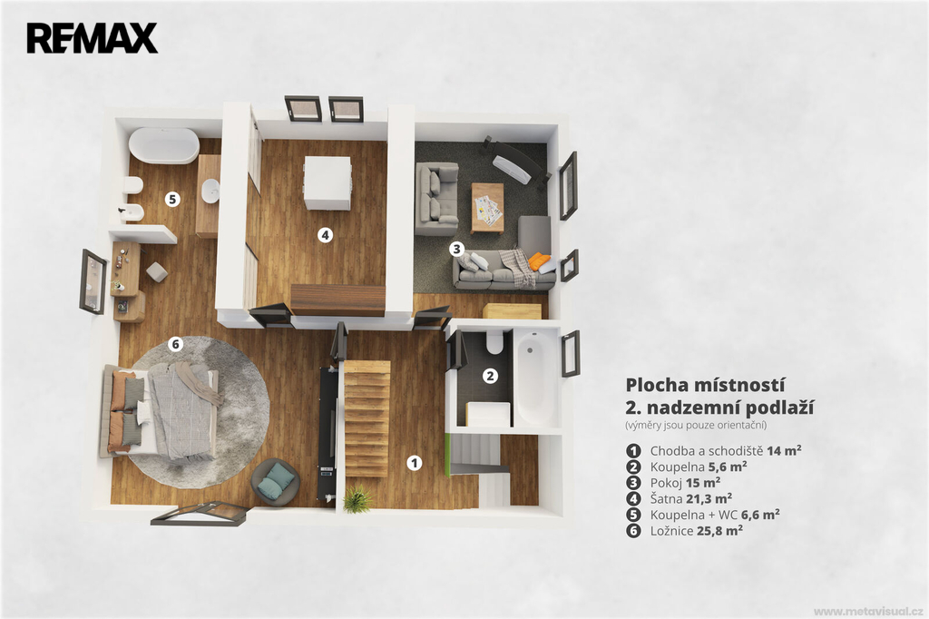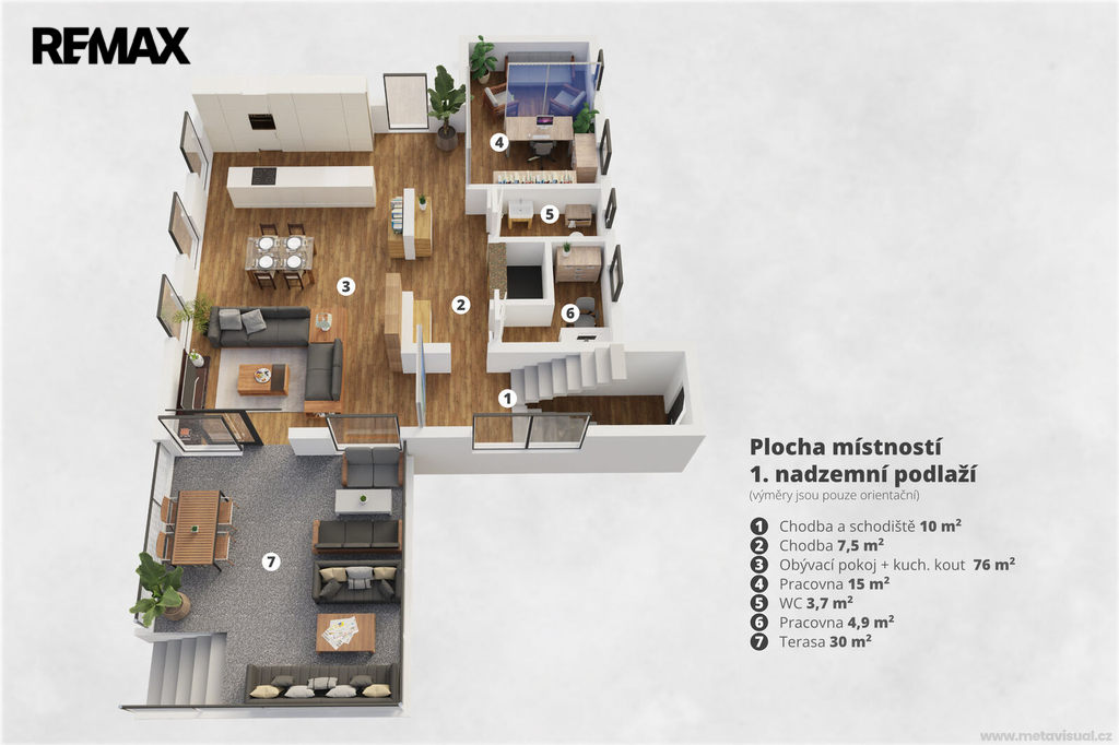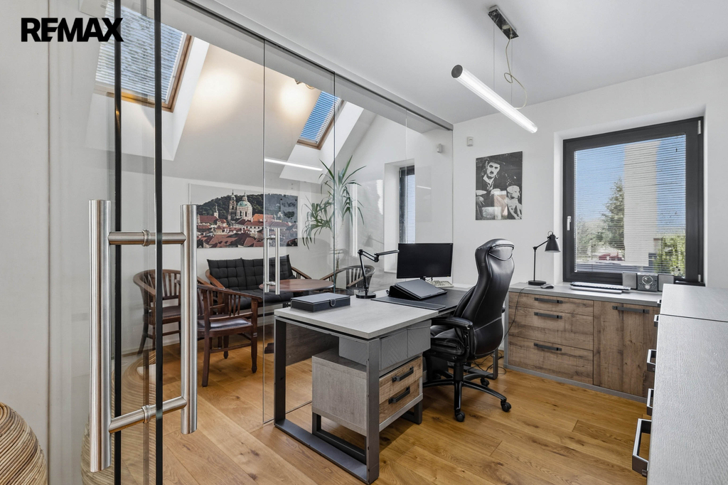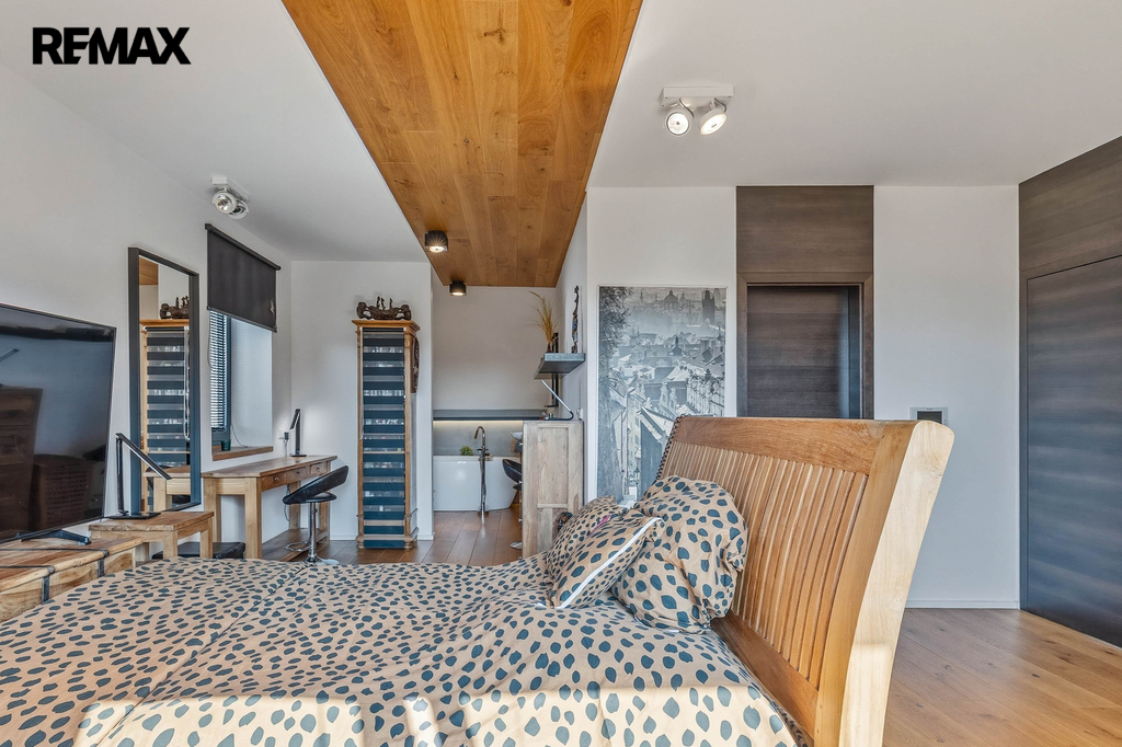 Dispozice domu nabízí dostatek prostoru pro rodinu, práci i odpočinek. Samozřejmostí je hlavní ložnice se šatnou, několik dalších pokojů, pracovna a tři koupelny, které zajišťují maximální komfort a soukromí.