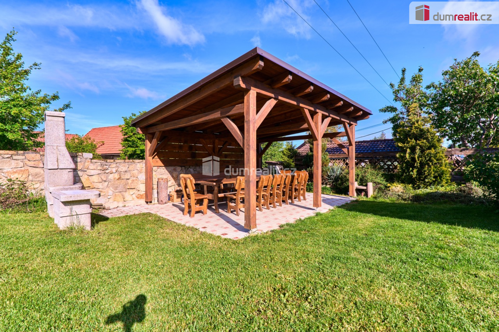Na pozemku se nachází okrasná zahrada, pergola, gril, dětské hřiště a osm parkovacích míst. Objekt je napojen na elektřinu, studnu (s možností připojení na obecní vodovod), kanalizaci a plyn je přiveden na hranici pozemku. K vytápění slouží elektrokotel a tepelné čerpadlo. V domě jsou tři bojlery (750 l, 120 l, 100 l). Energetickou soběstačnost podporuje fotovoltaická elektrárna, díky které se roční náklady na elektřinu pohybují kolem 20–25 tisíc korun.