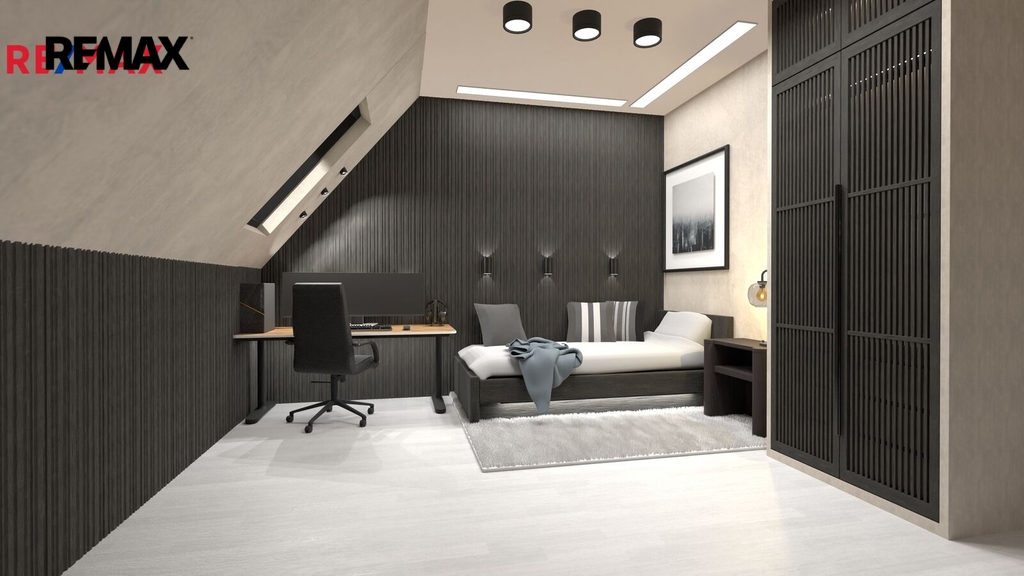 V patře se nachází dětský pokoj, prostorná ložnice a koupelna. Interiér je příjemně prosvětlen designovými střešními okny, která dodávají místnostem vzdušnost a přirozené světlo. K domu náleží dvě parkovací místa přímo před vstupem.