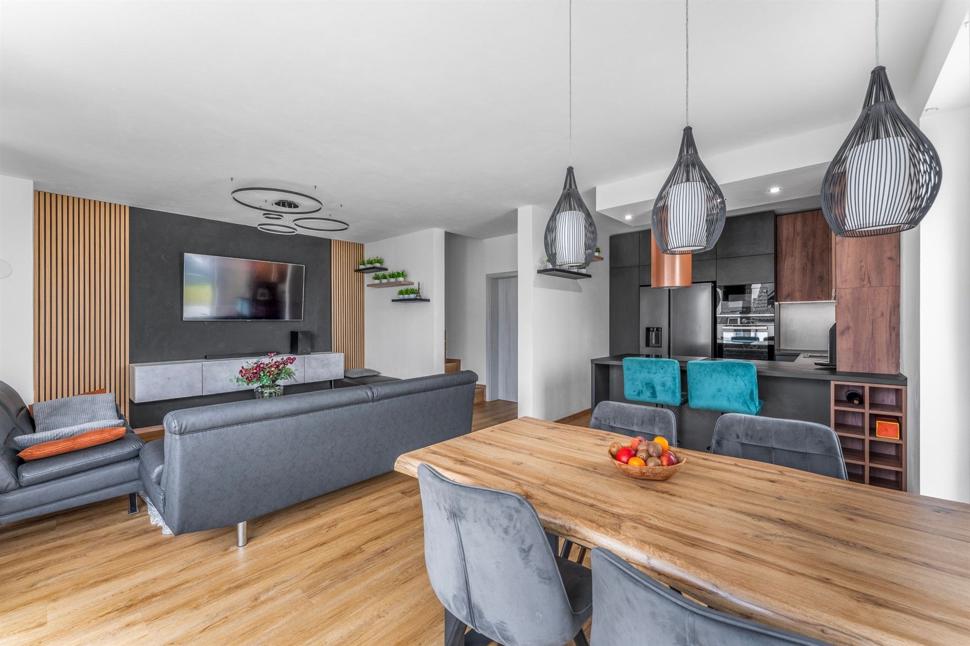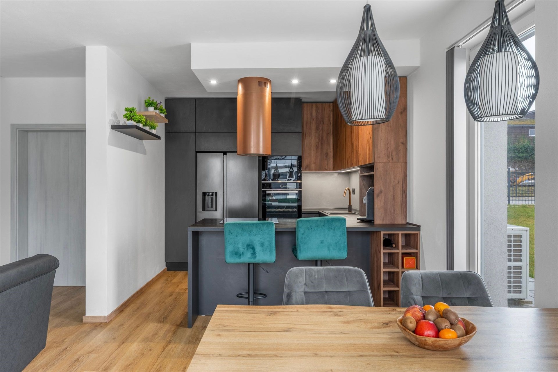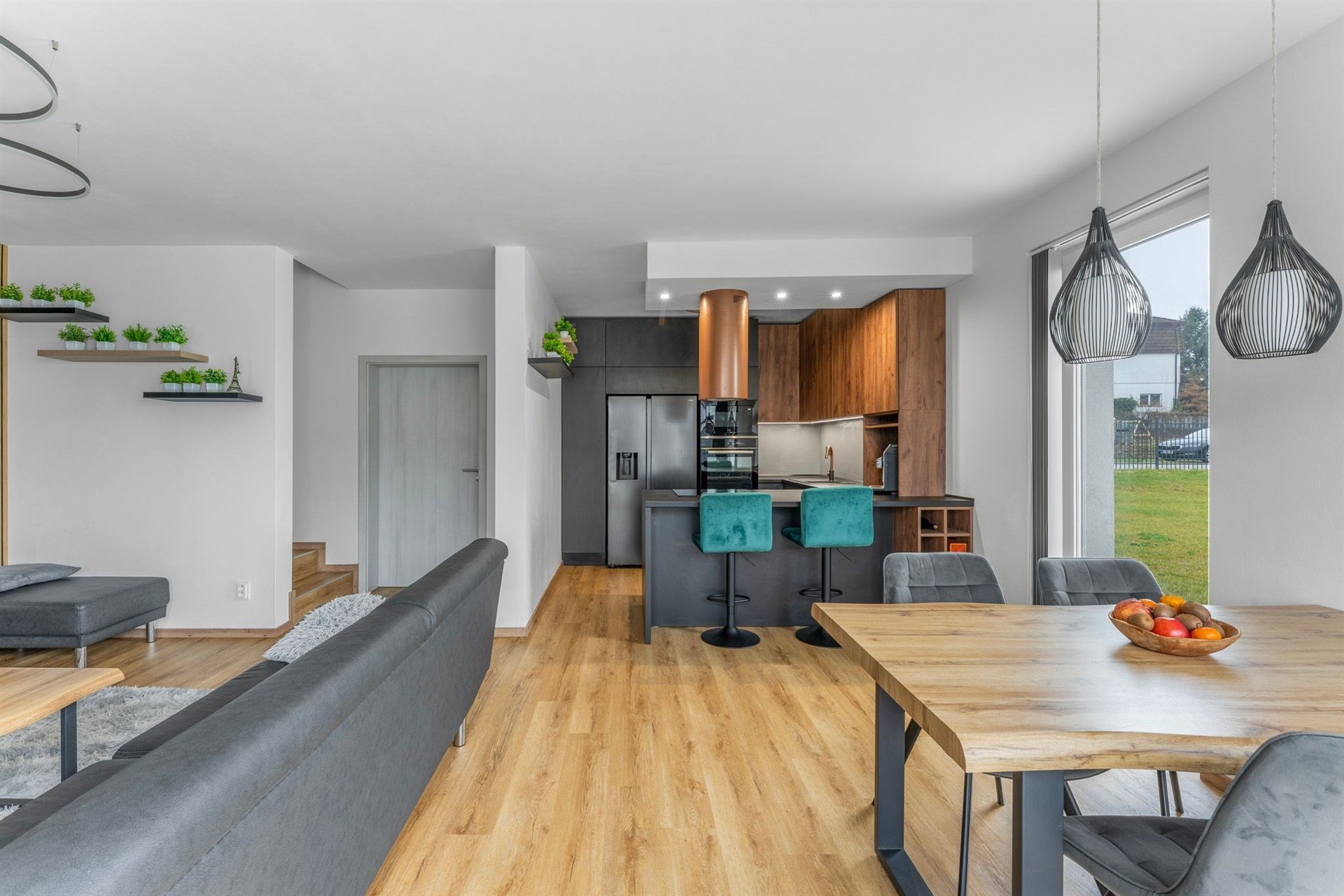 Kuchyň: Indukční varná deska, elektrická trouba, vestavěná lednice, vestavěný mrazák, mikrovlnná trouba, komínová digestoř, myčka nádobí.
