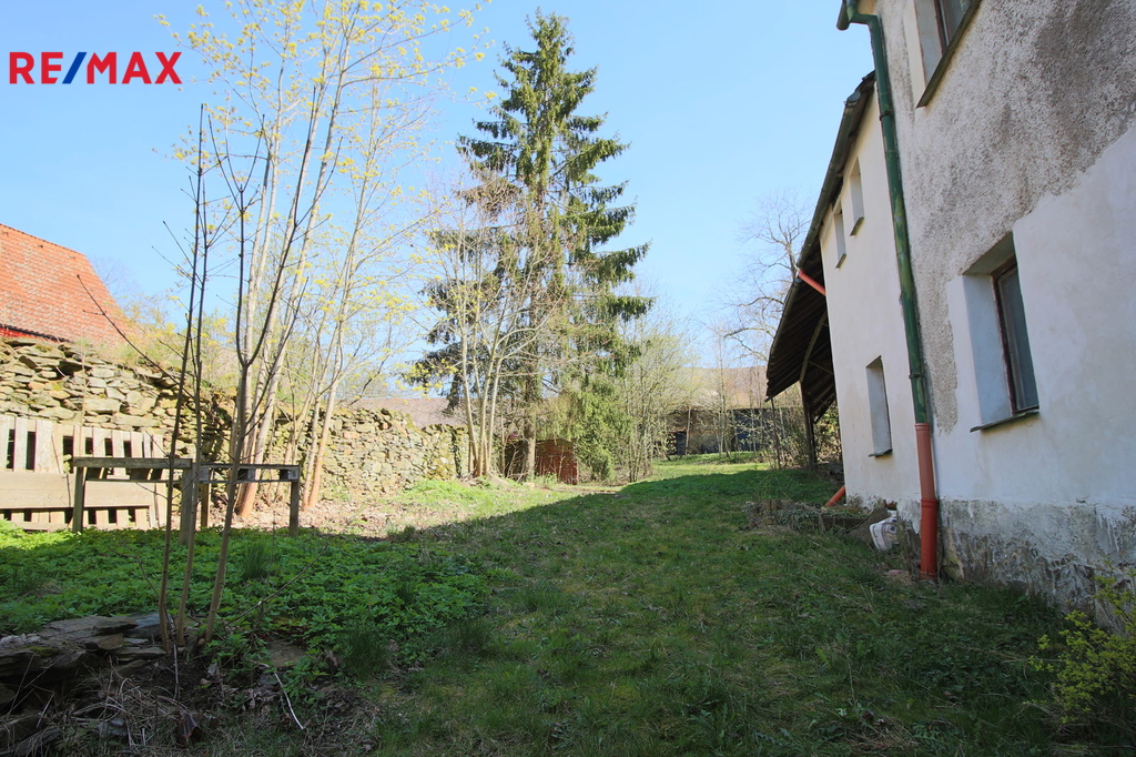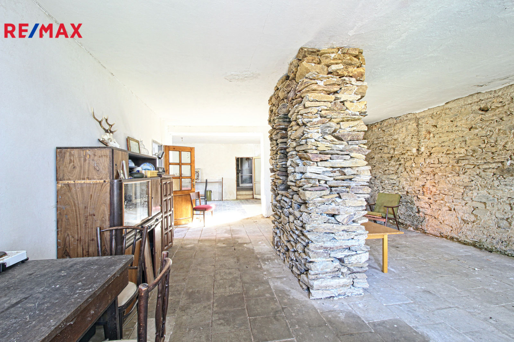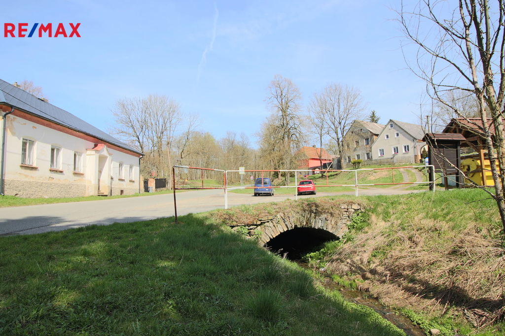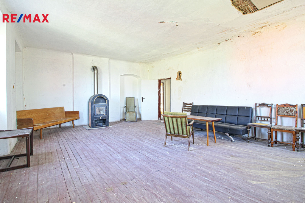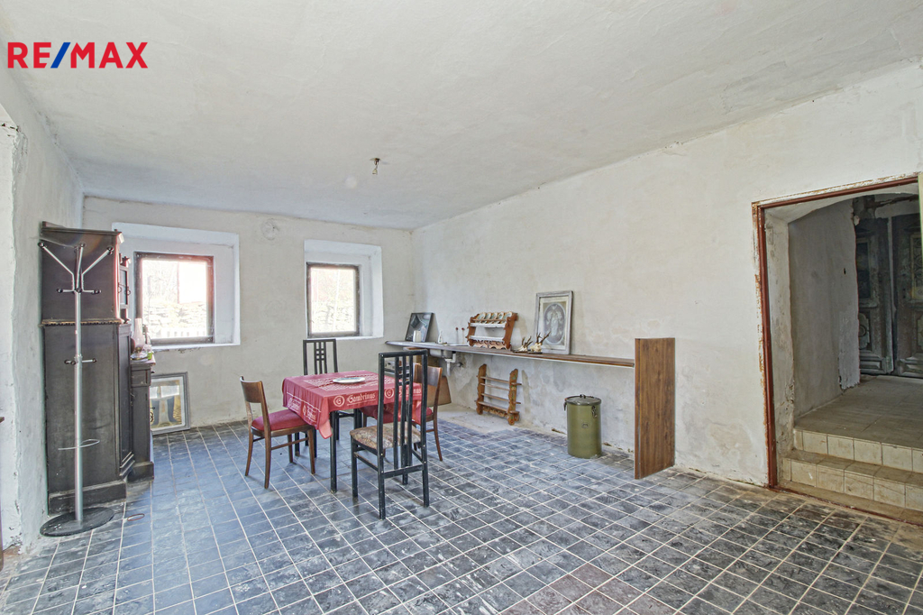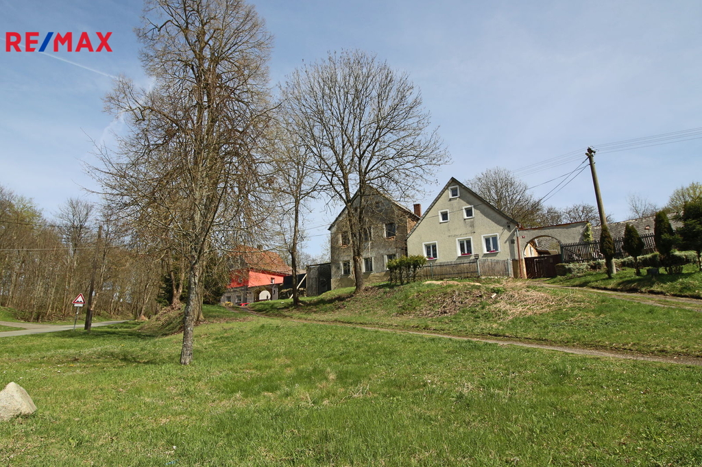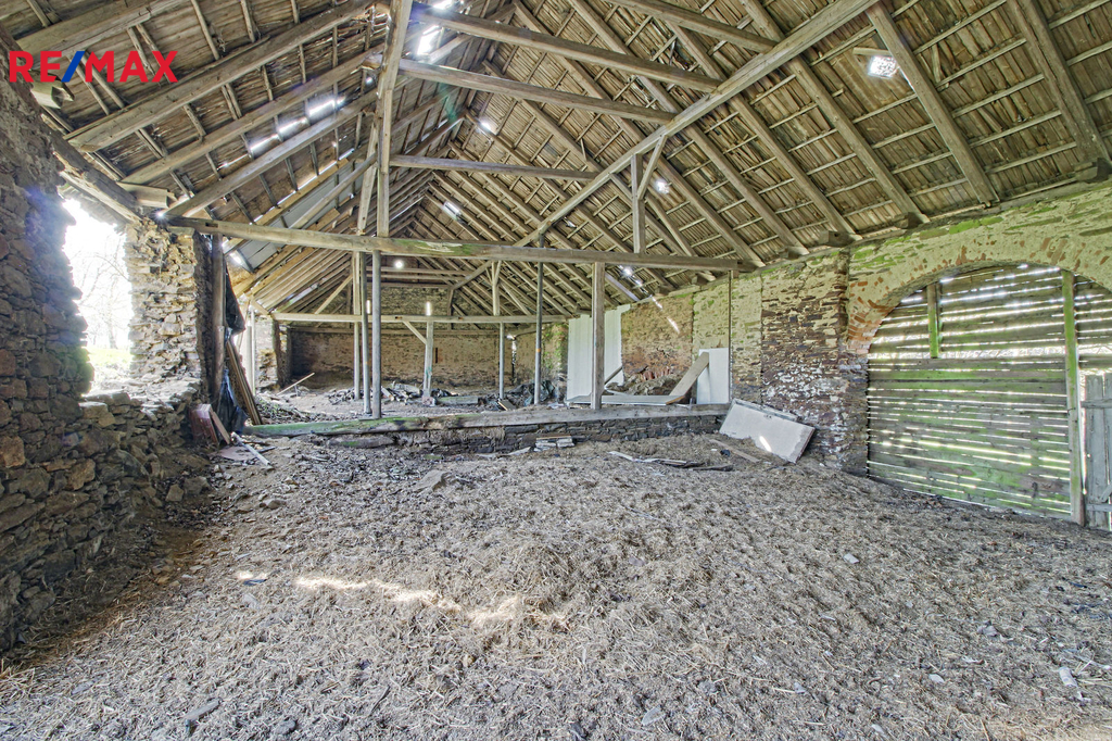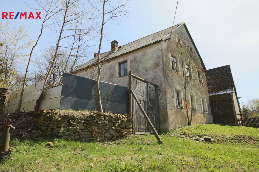 V přízemí o podlahové ploše cca 117 m2 se nachází dvě společenské místnosti, zázemí pro obsluhu objektu, koupelna, WC, chodba se schodištěm do sklepních prostor, ale i schodiště do prvního patra, které disponuje v rozloze cca 130 m2 čtyřmi ložnicemi, chodbou se schodištěm a místností se schodištěm na půdu, která opět nabízí možnost budoucího využití. Nemovitost má mnoho prvků poctivé architektury původních obyvatel Sudet. Na pozemcích o celkové ploše 2003 m2 se kromě objektu k bydlení nachází torzo původní stavby stájí a chlévů a hlavně prostorná stodola s krovem ve slušném stavu. Za stodolou najdeme zahradu o výměře 593 m2. Do objektu je přivedena elektřina i obecní vodovod. Kanalizaci řeší zabudovaný septik vedle domu. Aktuální stav celé nemovitosti dokládá přiložená fotodokumentace.