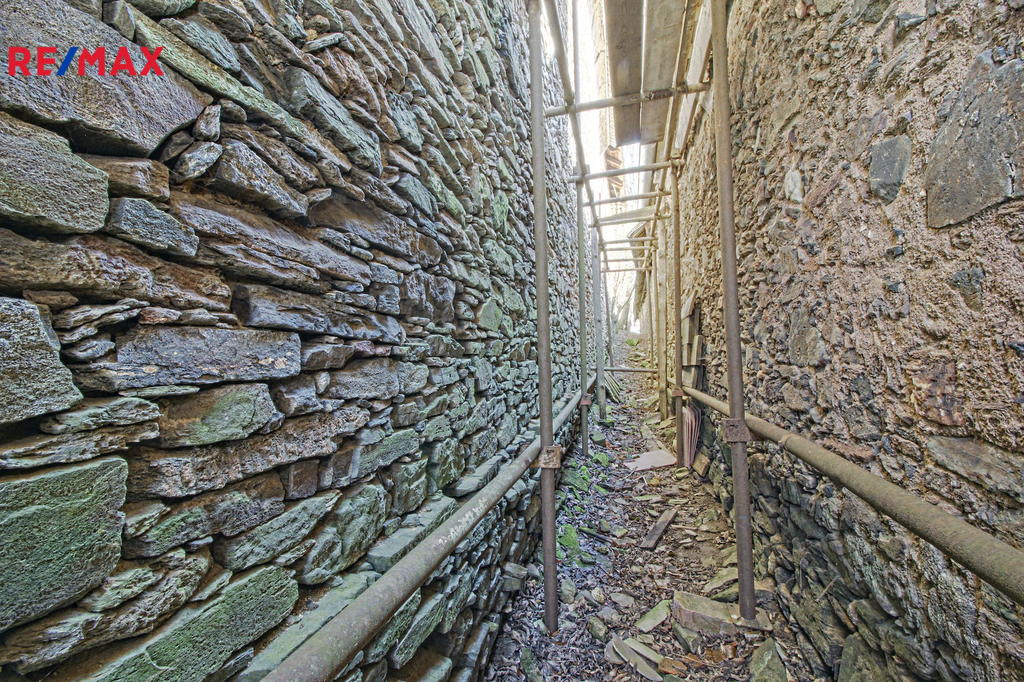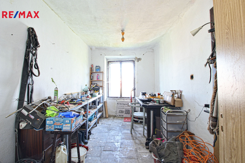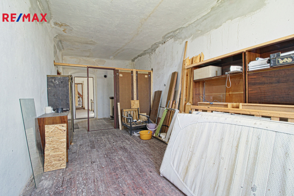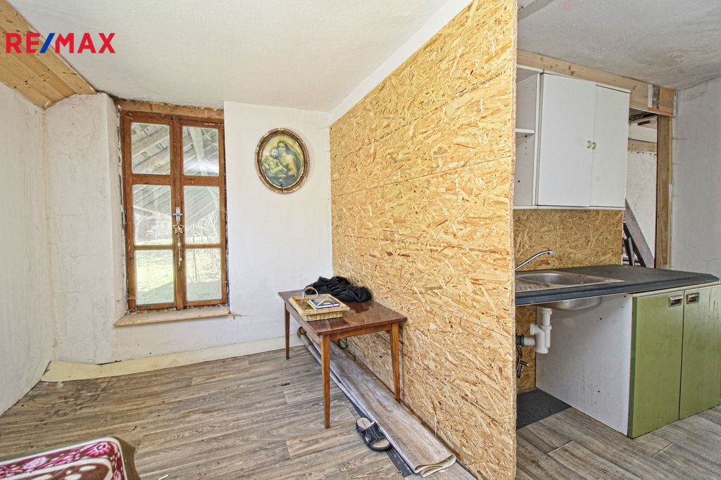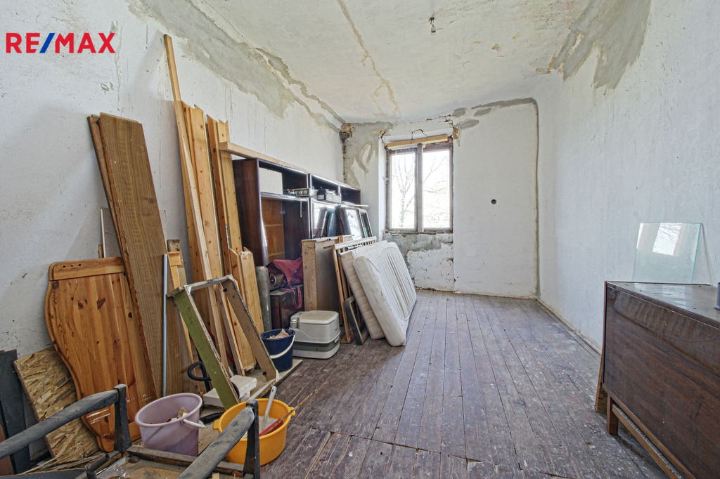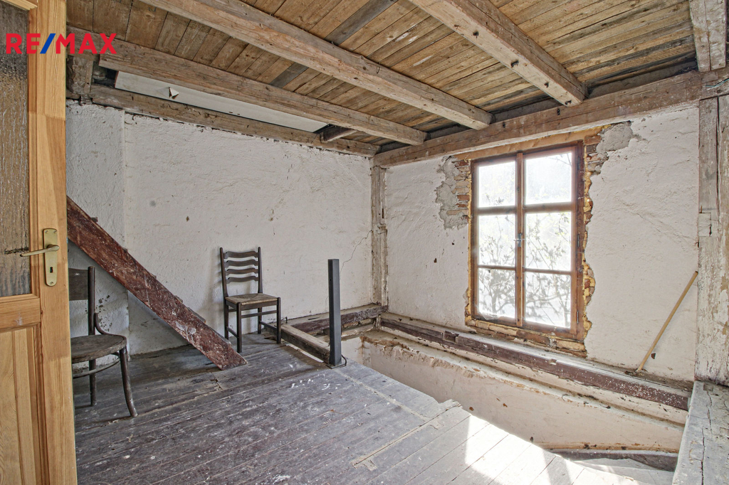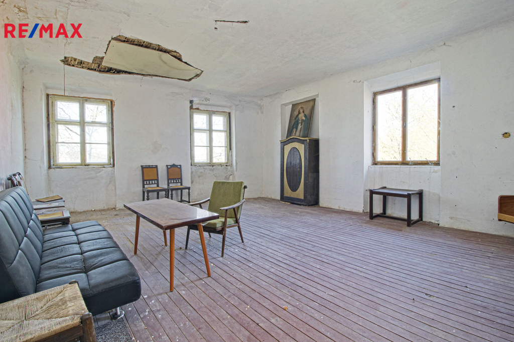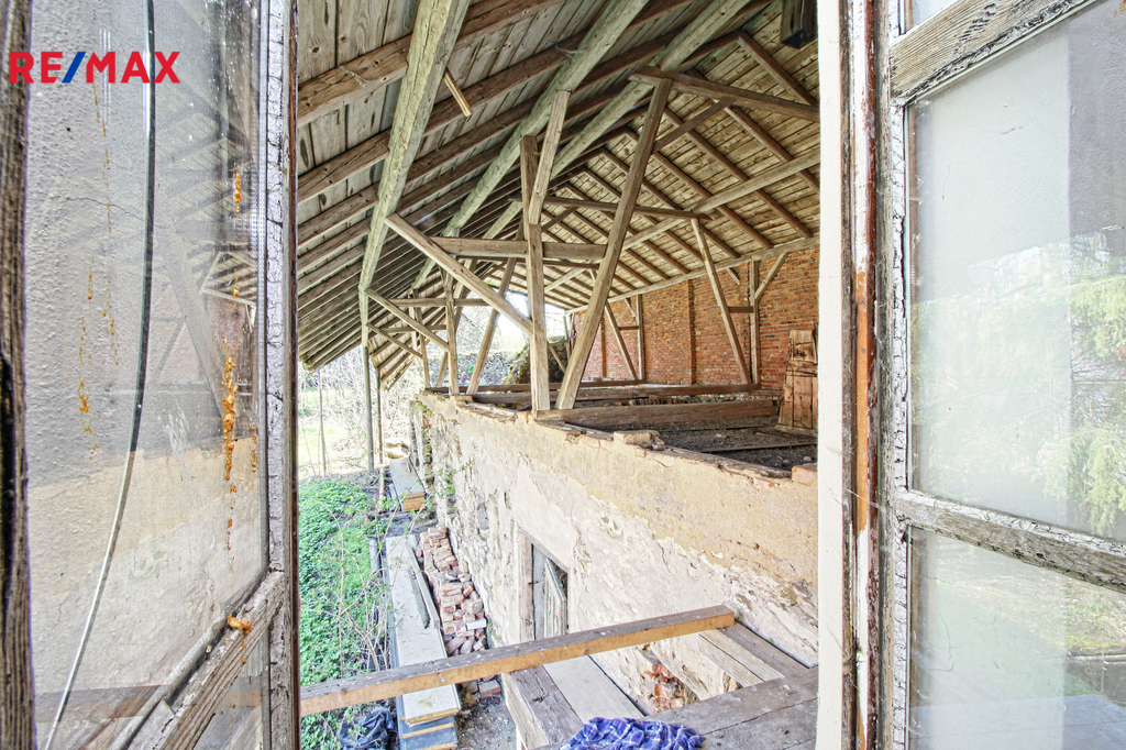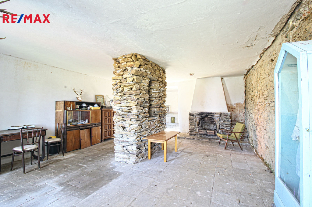 V přízemí o podlahové ploše cca 117 m2 se nachází dvě společenské místnosti, zázemí pro obsluhu objektu, koupelna, WC, chodba se schodištěm do sklepních prostor, ale i schodiště do prvního patra, které disponuje v rozloze cca 130 m2 čtyřmi ložnicemi, chodbou se schodištěm a místností se schodištěm na půdu, která opět nabízí možnost budoucího využití. Nemovitost má mnoho prvků poctivé architektury původních obyvatel Sudet. Na pozemcích o celkové ploše 2003 m2 se kromě objektu k bydlení nachází torzo původní stavby stájí a chlévů a hlavně prostorná stodola s krovem ve slušném stavu. Za stodolou najdeme zahradu o výměře 593 m2. Do objektu je přivedena elektřina i obecní vodovod. Kanalizaci řeší zabudovaný septik vedle domu. Aktuální stav celé nemovitosti dokládá přiložená fotodokumentace.