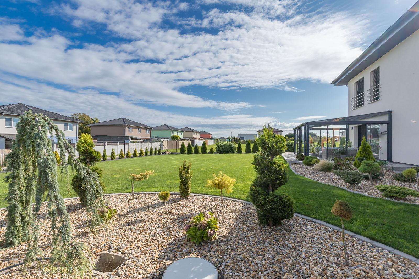 Pozemek je kompletně oplocen, přední část tvoří hliníkový plot LuxLine. Před domem se nachází prostorná plocha ze zámkové dlažby s možností pohodlného parkování pro více vozů, chodníky okolo celého domu, okrasné bezúdržbové záhony v přední i zadní části pozemku, živý plot po obvodu zahrady a studniční vrt.