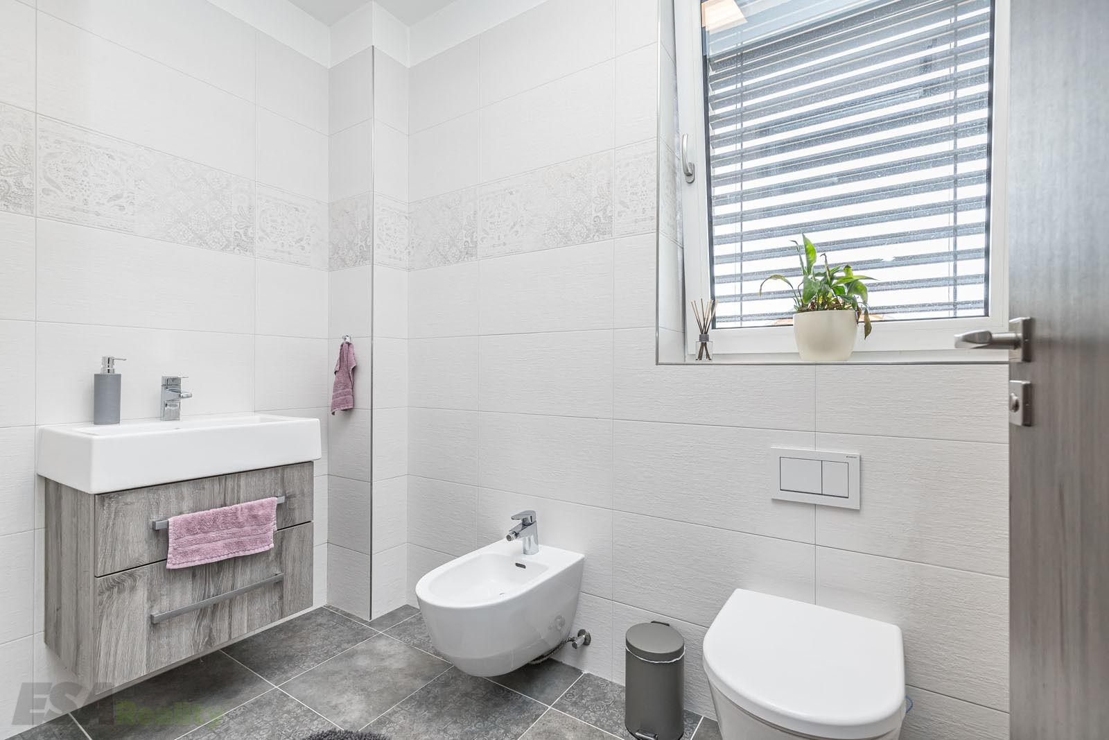2.podlaží – chodba s vestavěnou skříní, tři ložnice, koupelna s vanou a sprchou, samostatné WC s bidetem.