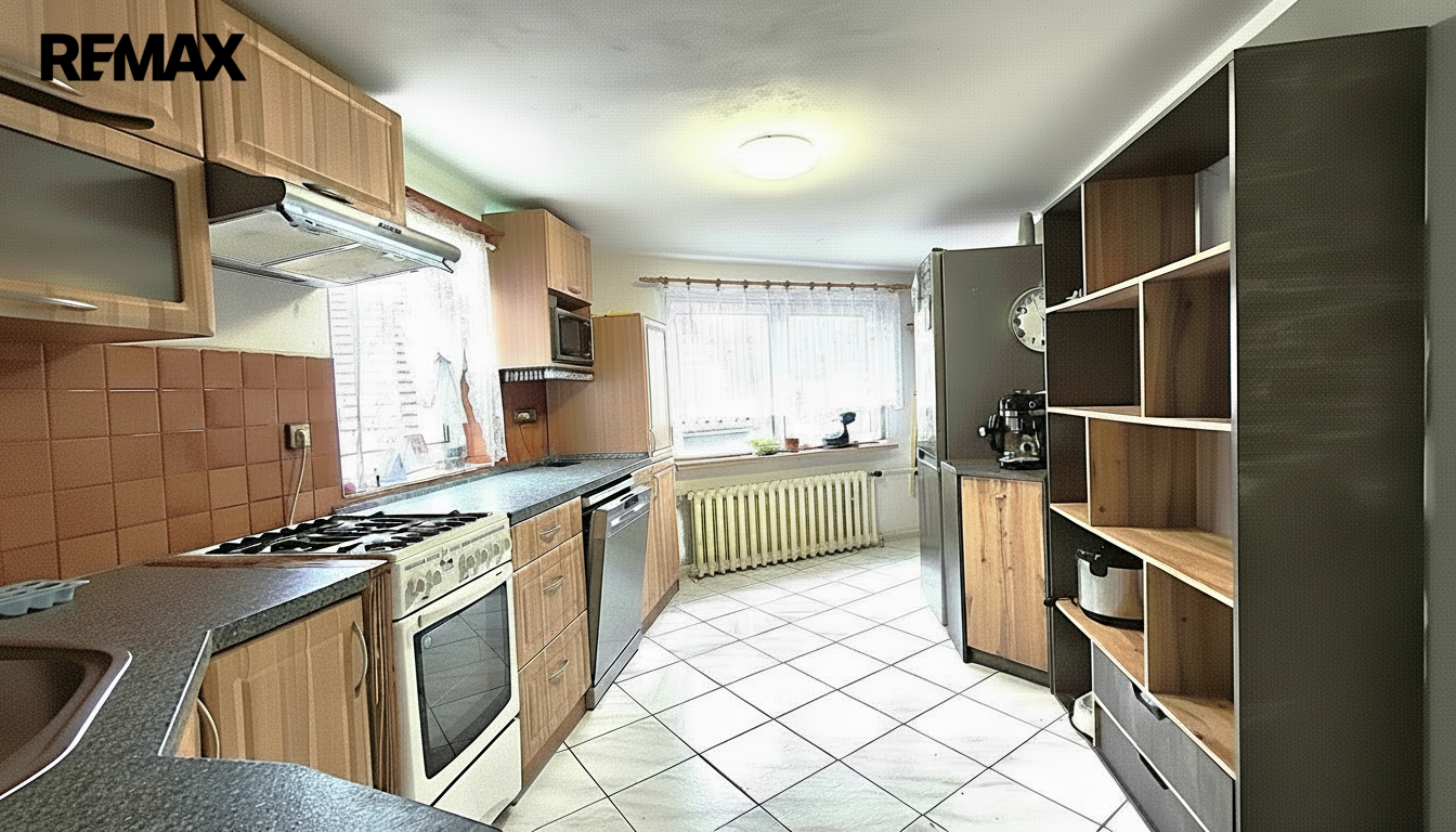 Dům je dispozičně řešen jako 3+1 s chodbou a prostornou kuchyní do tvaru L, která nabízí dostatek pracovní plochy i prostoru pro rodinný život. Kuchyňská linka byla vyrobena na míru přibližně před dvěma lety a vestavěné spotřebiče jsou součástí ceny. Na kuchyň navazuje obývací pokoj s jídelnou, což vytváří otevřený obytný prostor. Prostorná ložnice poskytuje dostatek soukromí. Díky plastovým oknům jsou místnosti světlé s výhledem do zeleně.