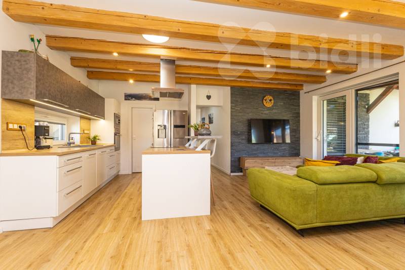 Dominantou domu je velkorysý obytný prostor s obývacím pokojem a kuchyňským koutem, jehož součástí je kuchyňská linka s vestavěnými spotřebiči a kuchyňský ostrůvek. Z obytné části je přímý vstup na terasu, která přirozeně rozšiřuje obytný prostor zejména v letních měsících. Stejně tak i ložnice má vlastní vstup na terasu, což ještě více podtrhuje příjemné propojení domu se zahradou.