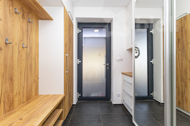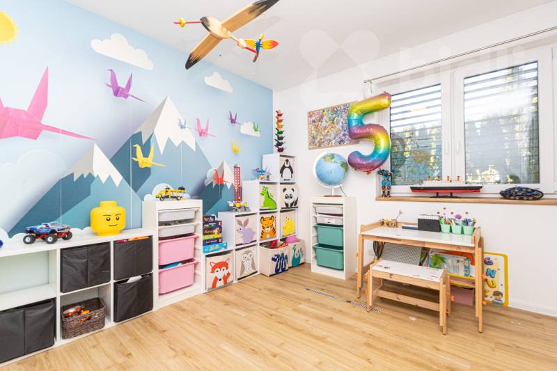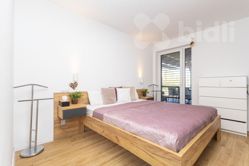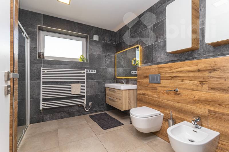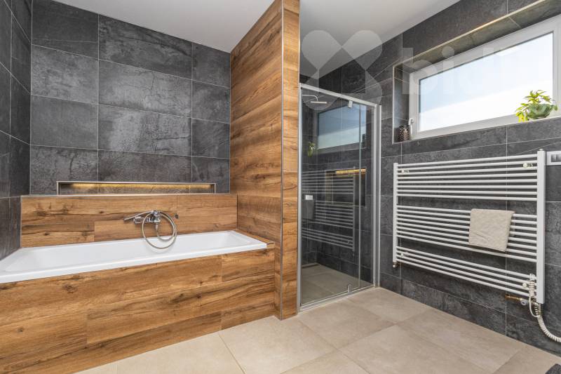 O vytápění domu se stará tepelné čerpadlo a v celém domě je podlahové vytápění, které zajišťuje vysoký komfort bydlení, který doplňují i venkovní elektrické žaluzie.