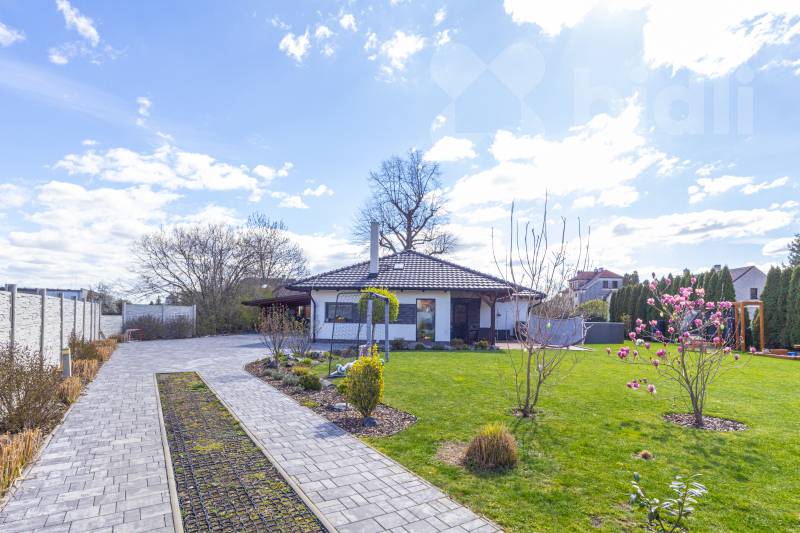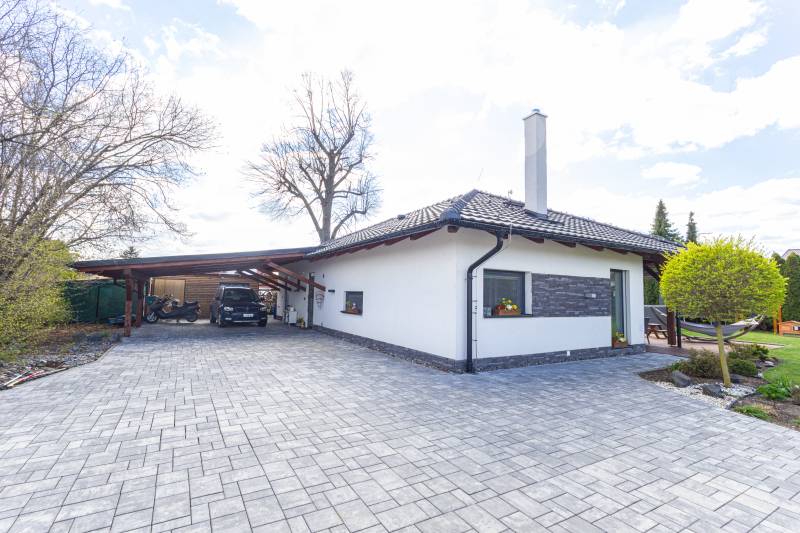 Na dům navazuje kryté parkovací stání a zahradní domek na nářadí. Pozemek je kompletně oplocen, příjezdová cesta je vydlážděna zámkovou dlažbou a venkovní terasa je krytá. Z domu i terasy je krásný pohled na upravenou zahradu s okrasnou zelení.