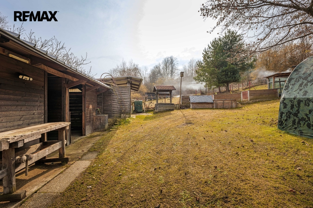 Na pozemku s celkovou plochou 1.376 m2 se nachází hlavní obytná stavba (kolaudována jako stavba pro rodinou rekreaci a cca 15 roků využívána pro trvalé bydlení) s vedlejšími a doplňkovými objekty, příslušenstvím a zařízením.