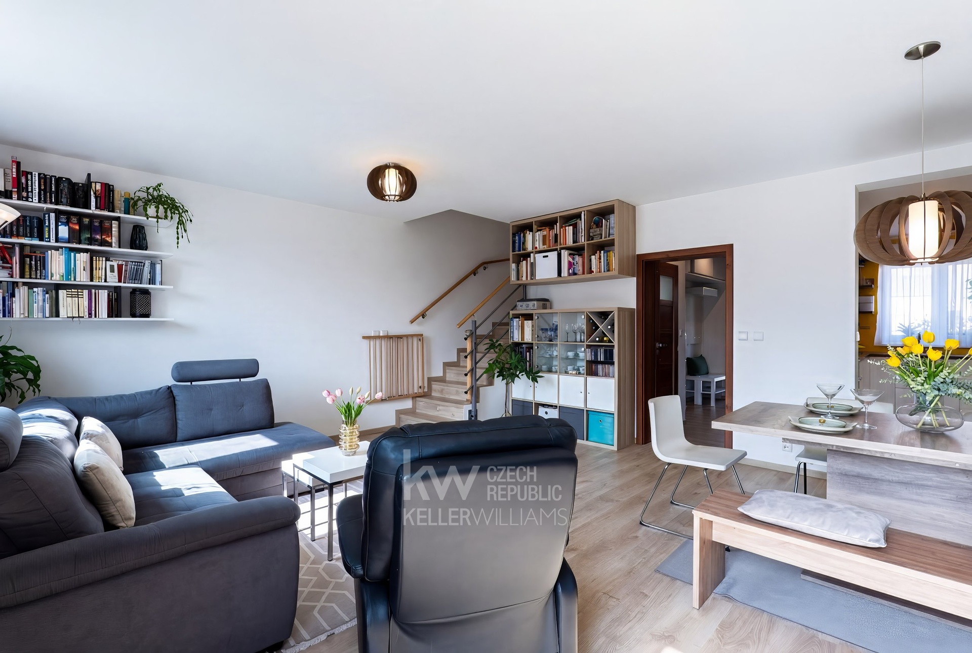 - Velký obývací pokoj s kuchyňským koutem, kam se pohodlně vejde velký gauč, jídelní stůl pro šest osob a přitom stále poskytuje dostatek prostoru.
