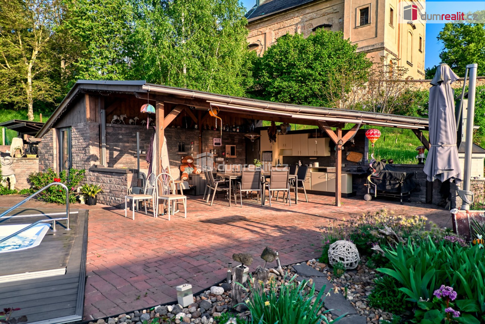 stylově nasvícená venkovní kuchyně a celá zahrada,