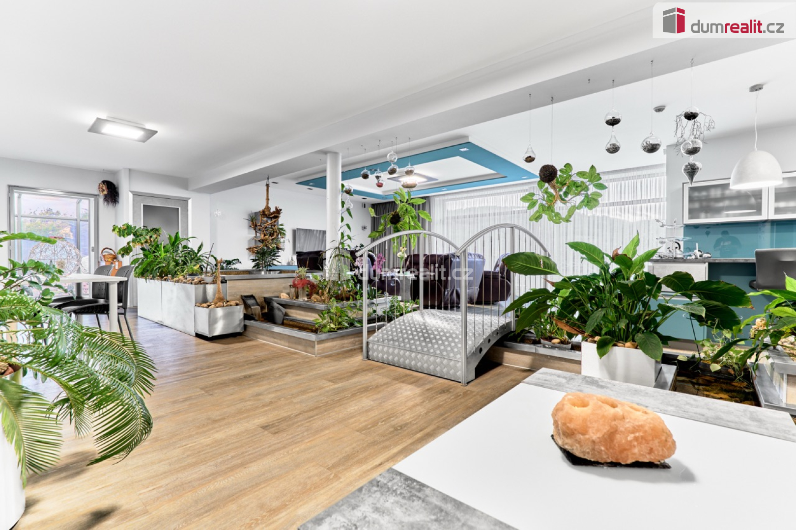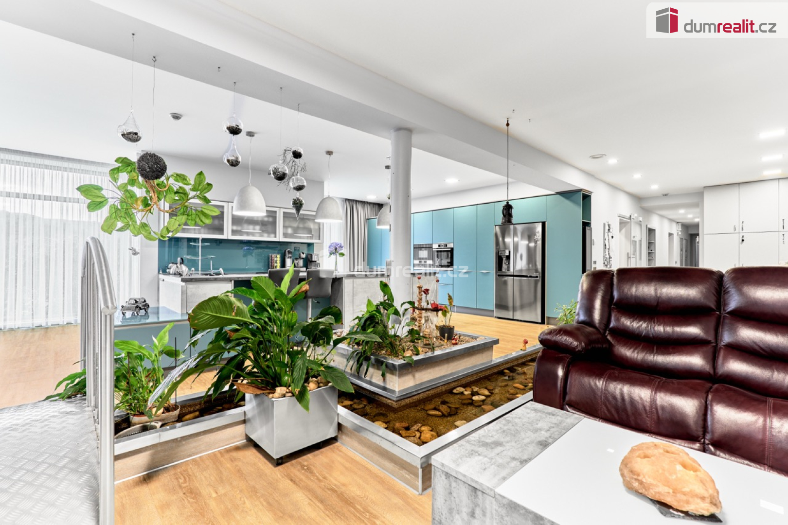 Dominantou vily je velkorysý obytný prostor s kuchyní o rozloze cca 142 m², jehož srdcem jsou dvě jezírka propojená tekoucím potůčkem. Tento živý přírodní prvek se nachází přímo uvnitř domu a tvoří jedinečné centrum celého prostoru – místo klidu, světla a výjimečné atmosféry.