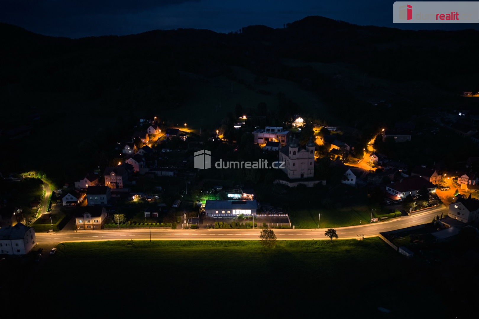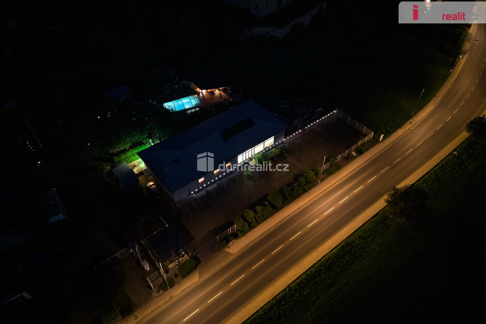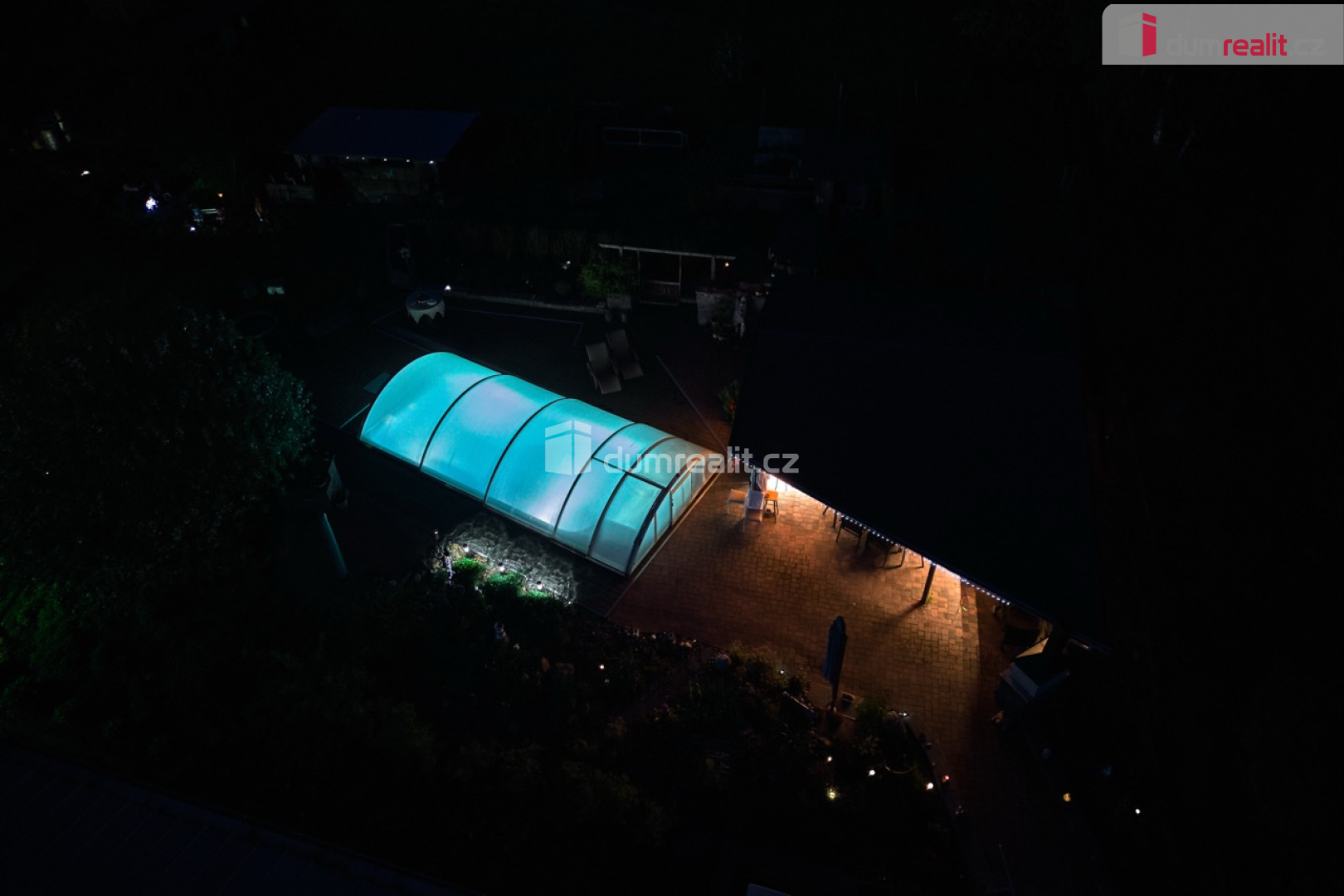 stylově nasvícená venkovní kuchyně a celá zahrada,