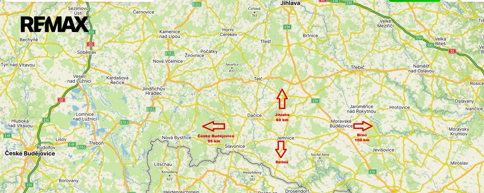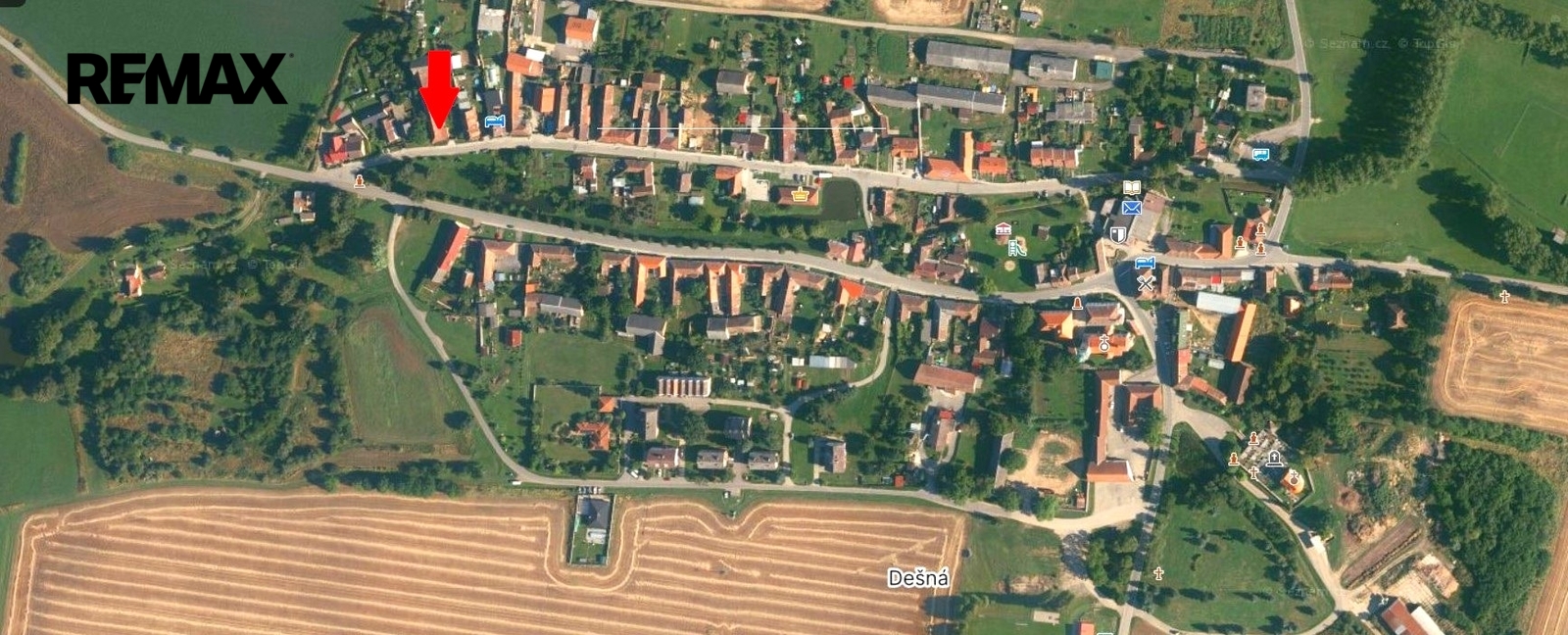 Obec Dešná u Dačic leží 5 km od hranic s Rakouskem, na pomezí Čech a Moravy. Je obklopena členitou krajinou, ve které je mnoho lesů, rybníků a luk. Obec disponuje základní občanskou vybaveností jako je základní škola a školka, obecní úřad, zdravotní středisko, zvěrolékař, pošta, knihovna, samoobsluha s potravinami a smíšeným zbožím, pohostinství, autobusová zastávka apod. Obec se nachází 8 km od města Jemnice disponující kompletní občanskou vybaveností a 18 km od města Dačice, obce s rozšířenou pravomocí. Prodávající si vyhrazuje právo vybrat kupujícího na základě jím zvolených kritérií.